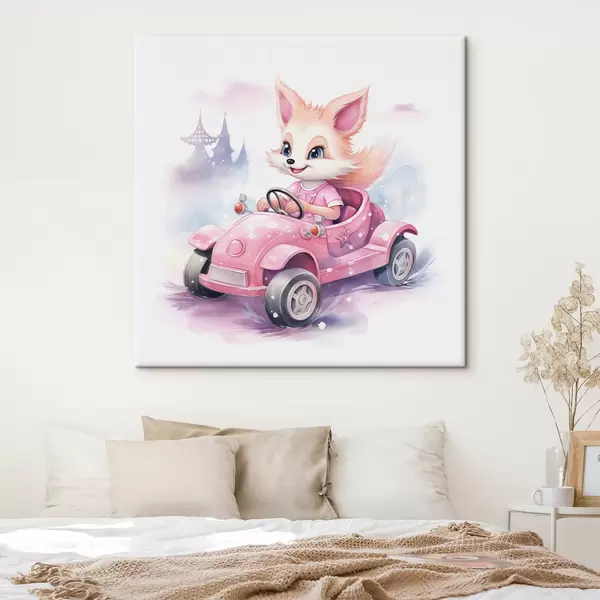 Wandbilder Kleiner Fuchs fährt ein rosa Auto Aquarell-Illustration für Kinder Art. s38943