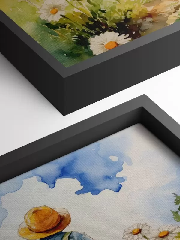 Wandbilder Ein Junge mit Cowboyhut, grünem Rucksack auf dem Rücken und blauem Anzug geht einen Weg durch ein Kamillenfeld entlang, Aquarell Art. s38946