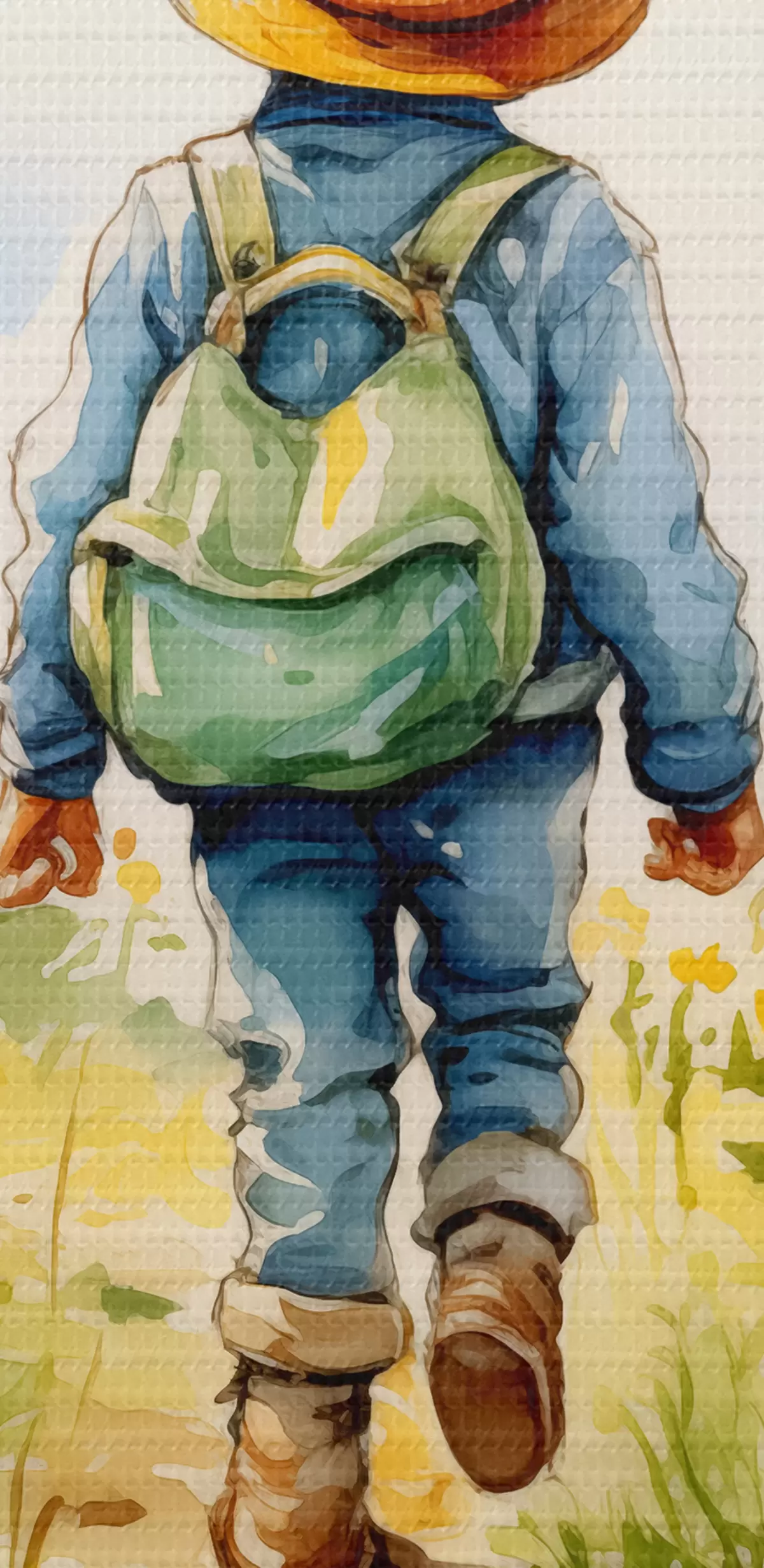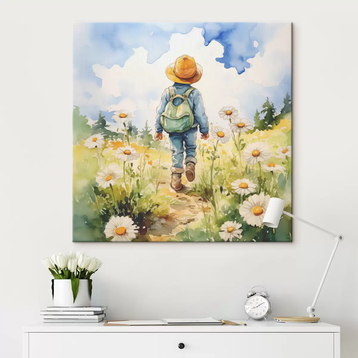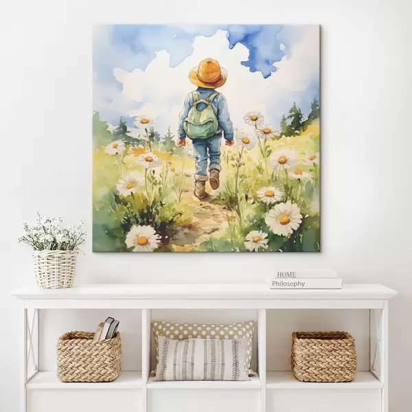 Wandbilder Ein Junge mit Cowboyhut, grünem Rucksack auf dem Rücken und blauem Anzug geht einen Weg durch ein Kamillenfeld entlang, Aquarell Art. s38946