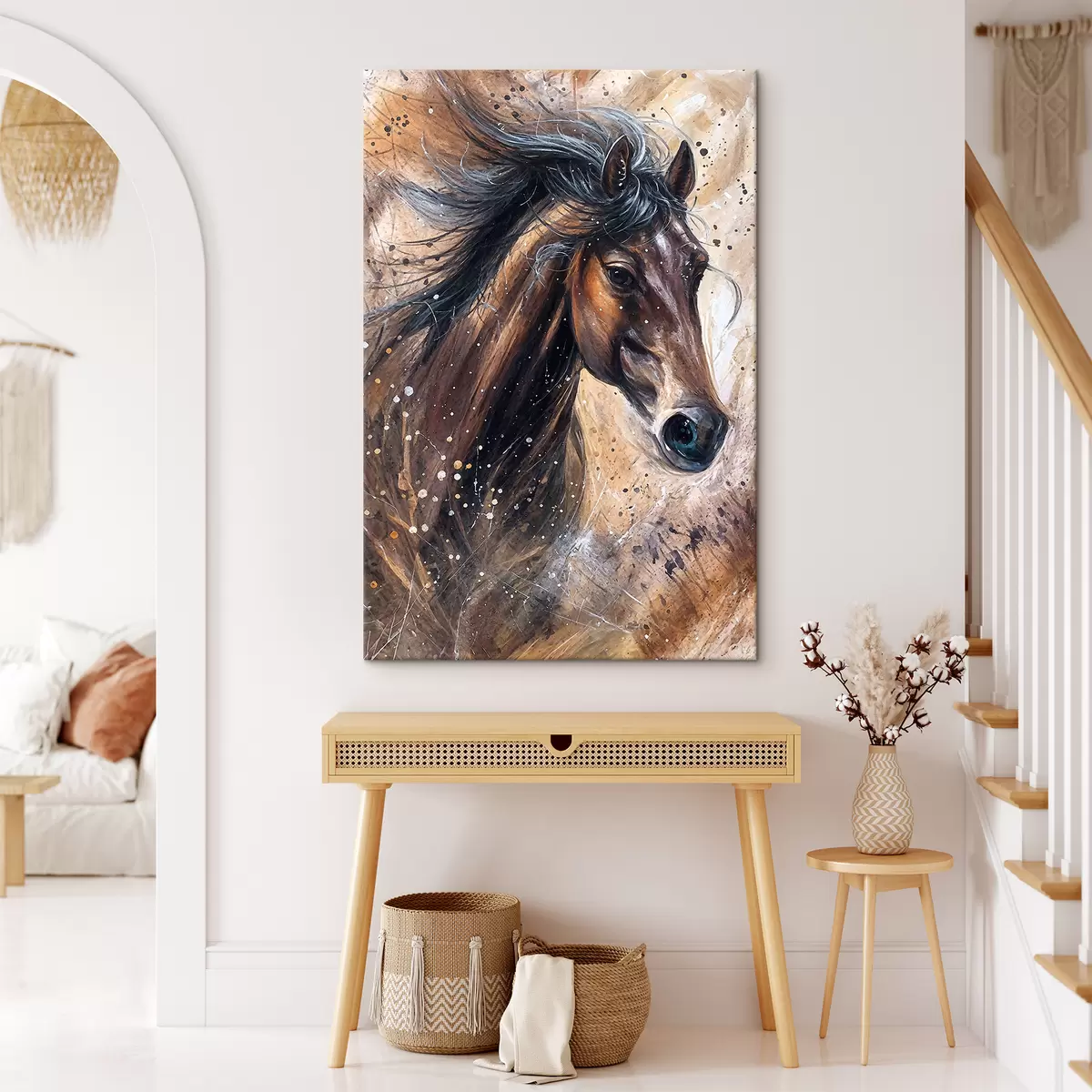 Wandbilder Gemälde eines braunen Pferdes mit wallender Mähne vor einem strukturierten Hintergrund mit Farbspritzern Art. s38959