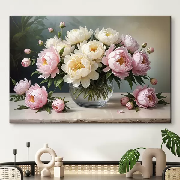 Wandbilder Gemälde eines Straußes wunderschöner weißer und rosa Pfingstrosen in einer Glasvase auf einem Holztisch s38967