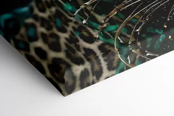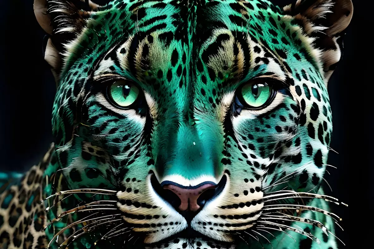 Wandbilder Ein Nahaufnahmeporträt eines wilden Leoparden mit grünen Augen und leuchtend türkisfarbenem und schwarz geflecktem Fell Art. s38979