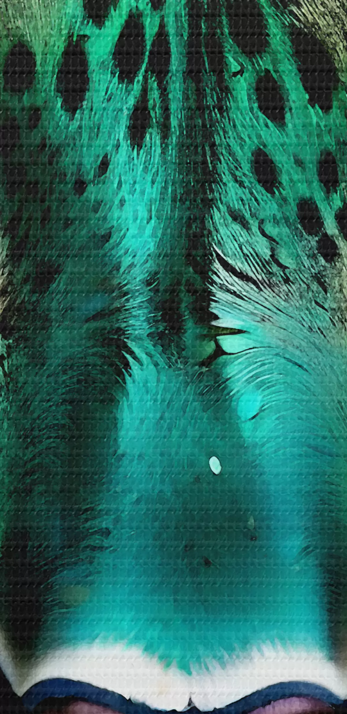 Wandbilder Ein Nahaufnahmeporträt eines wilden Leoparden mit grünen Augen und leuchtend türkisfarbenem und schwarz geflecktem Fell s38979