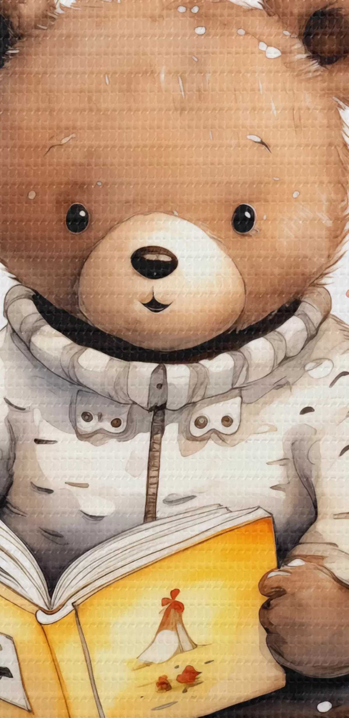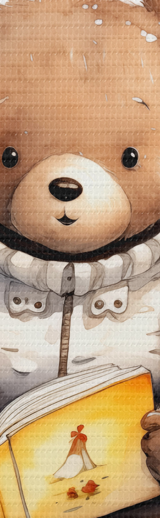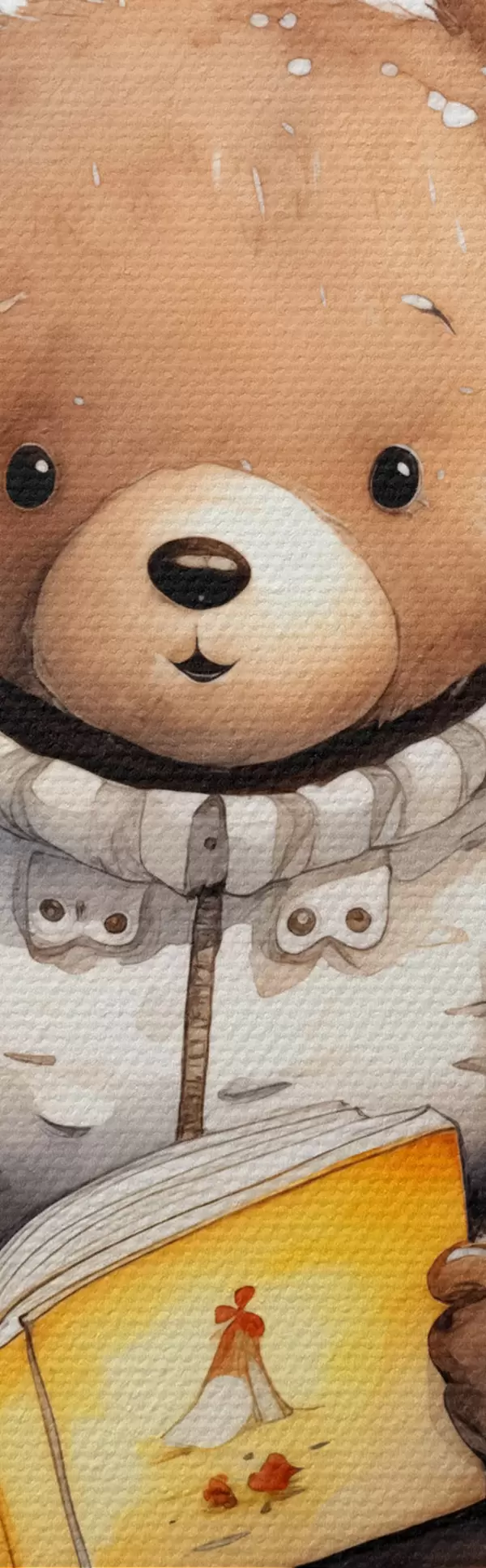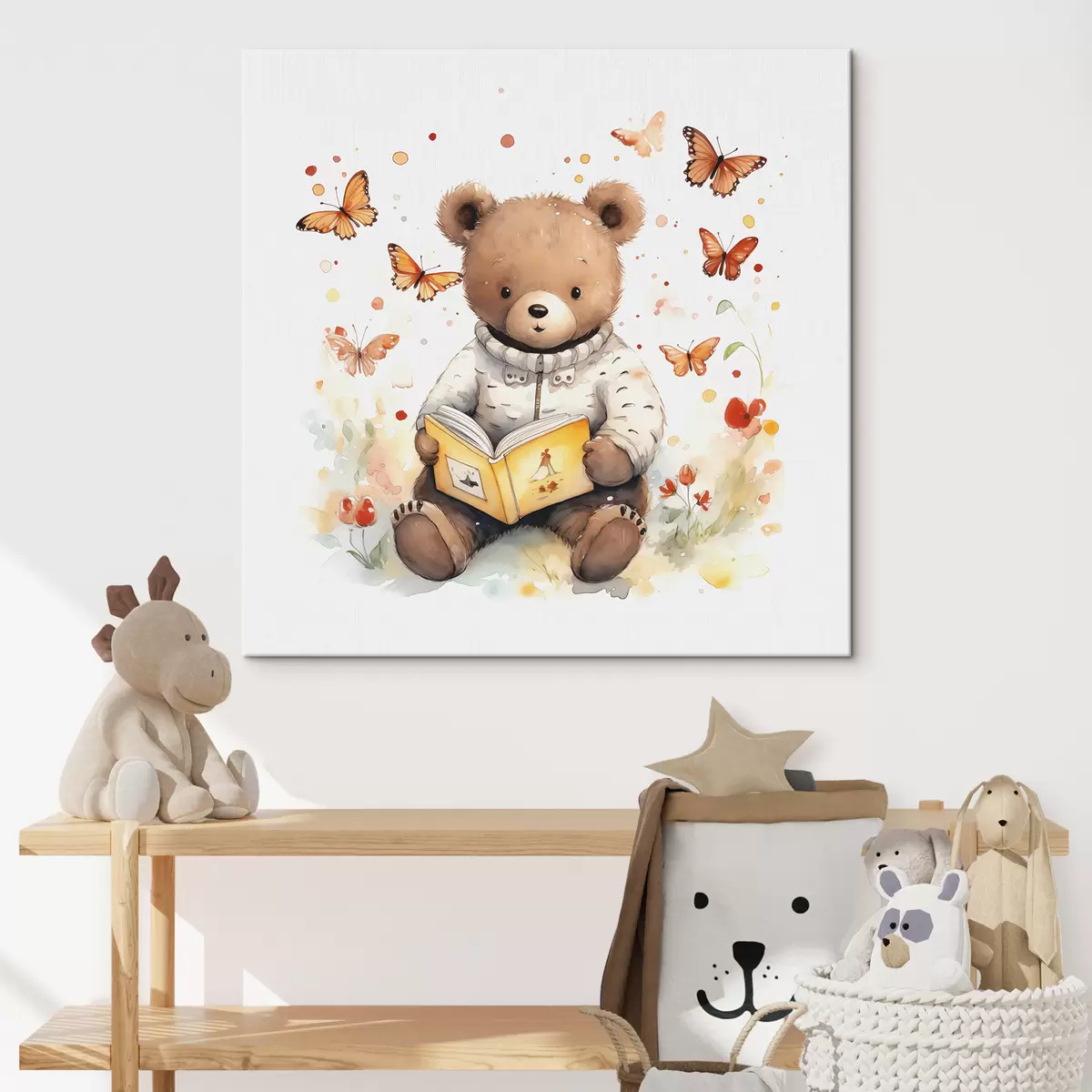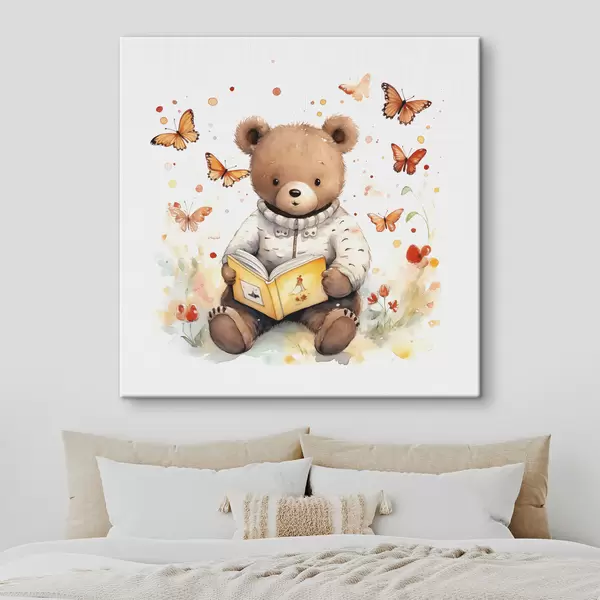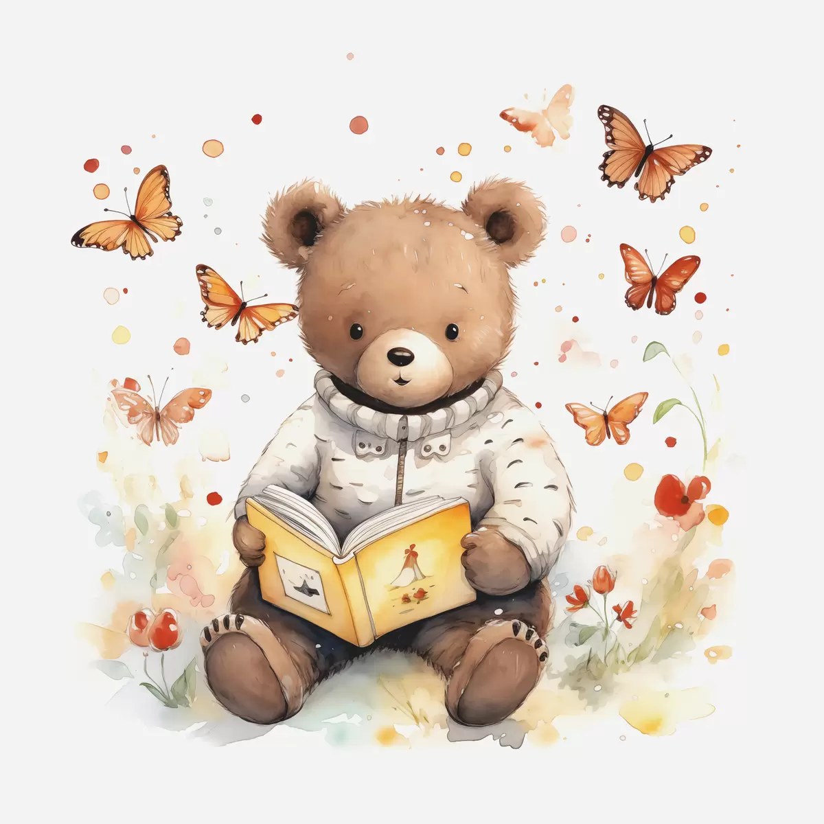 Wandbilder Braunbärjunges im Pullover liest ein Buch, umgeben von Aquarell-Schmetterlingen s39025