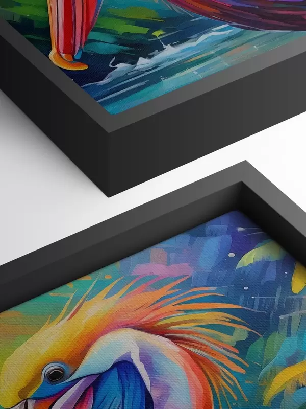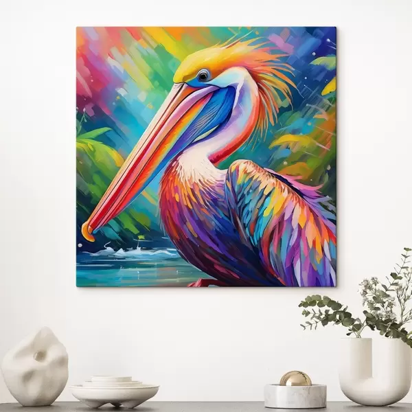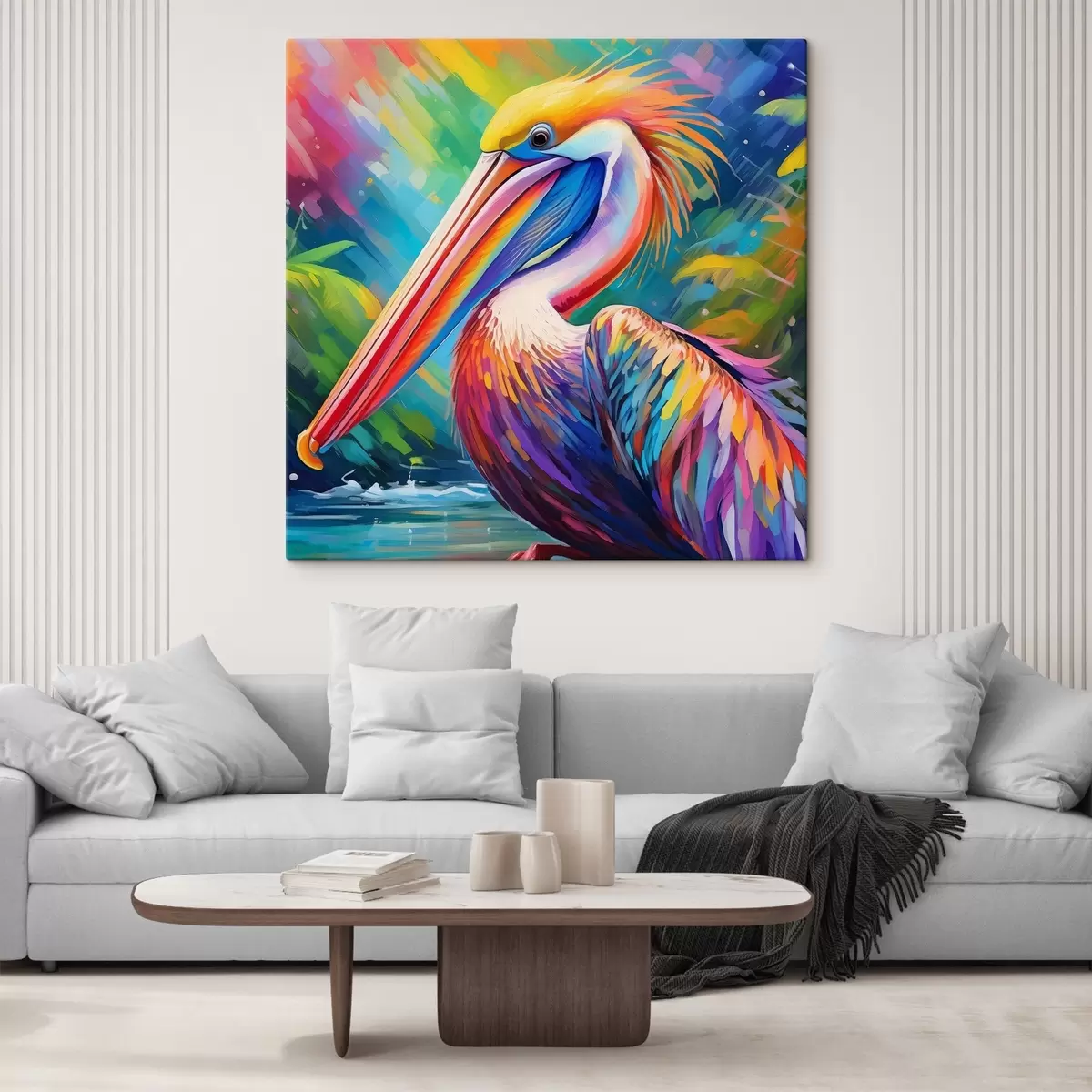 Wandbilder Lebendiger Pelikan vor farbenfroher Kulisse Art. s39054