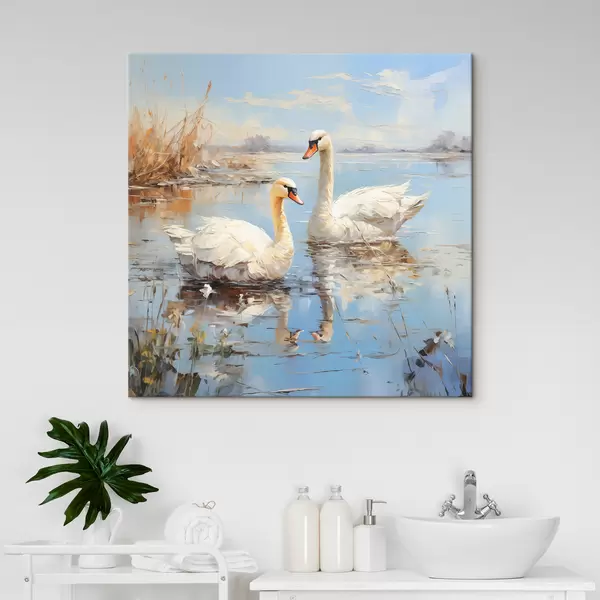 Wandbilder Weiße Gänse schwimmen entlang des Flusses zwischen dem Schilf, blau, weiß, beige Farbe Art. s39130