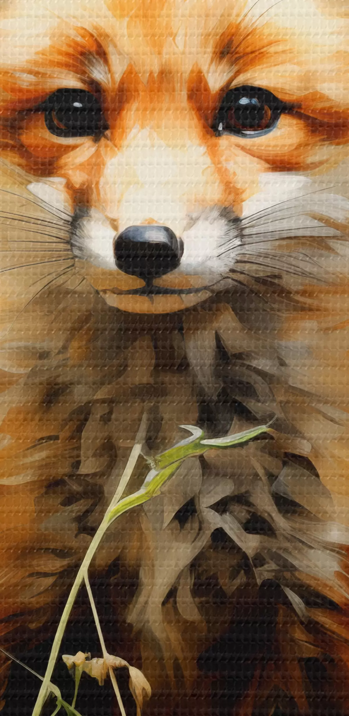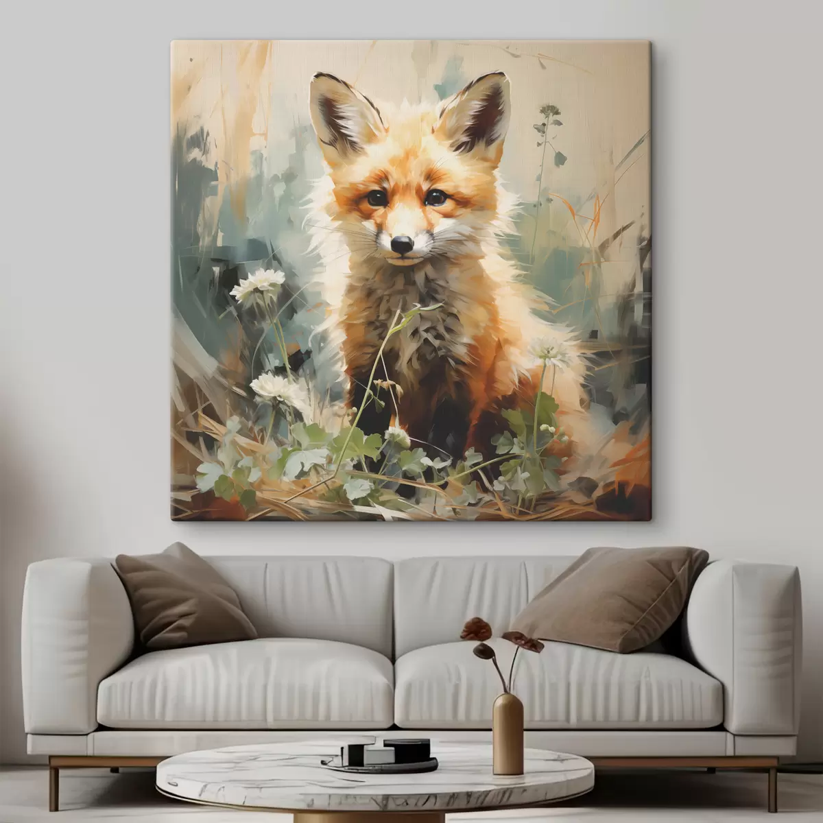 Wandbilder Roter Fuchs sitzt im trockenen Gras auf einem grünen Hintergrund Ölgemälde s39191