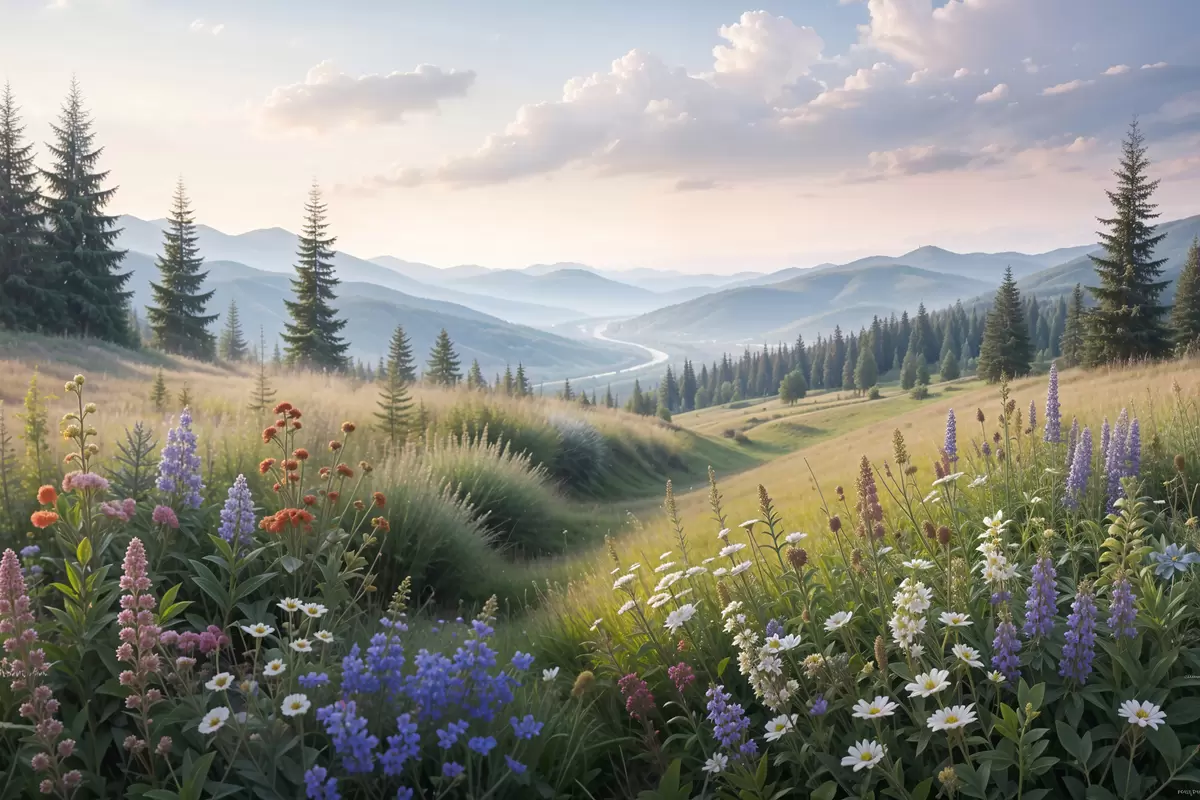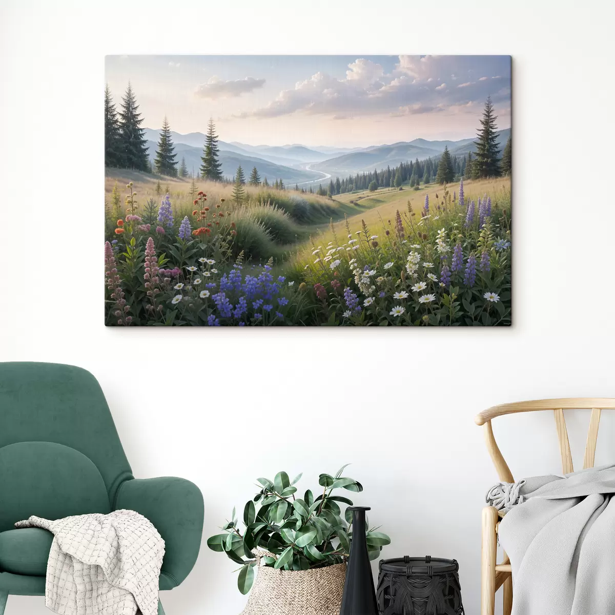 Wandbilder Berglandschaft mit einer Graswiese im Vordergrund voller bunter Wildblumen Art. s39382