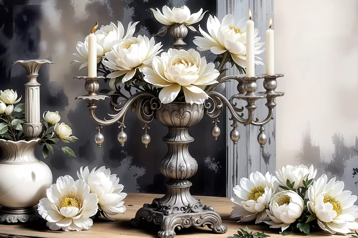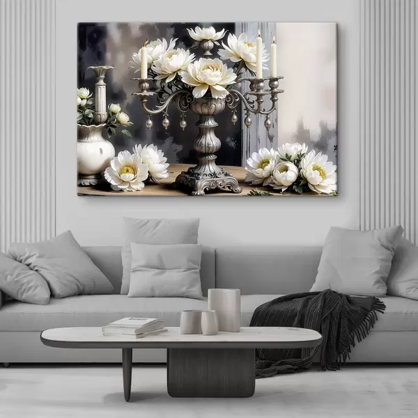 Wandbilder Ein Strauß großer weißer Dahlienblüten in einer verzierten silbernen Vase, umgeben von brennenden Kerzen auf einem Holztisch Art. s39384