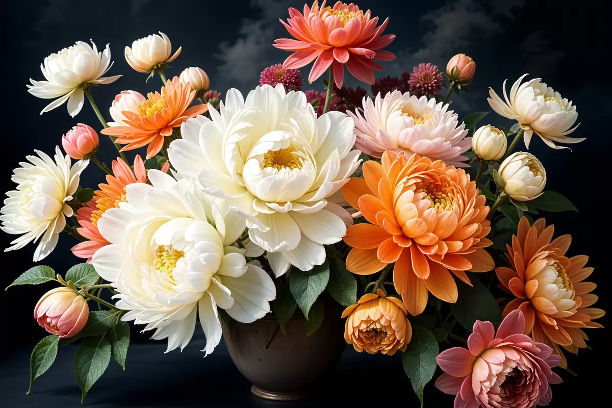 Wandbilder Ein Strauß leuchtender Dahlienblüten in verschiedenen Farben vor dunklem Hintergrund Art. s39399