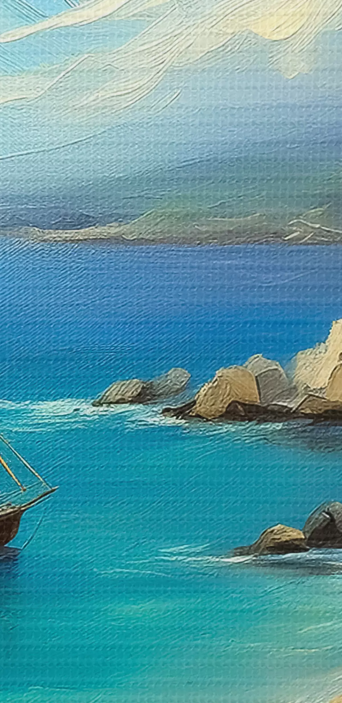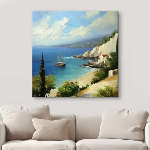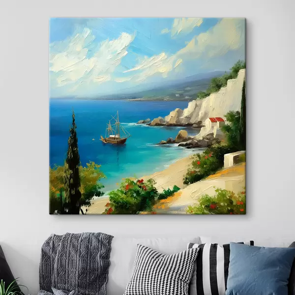 Wandbilder Griechische Küste, Schiff, blaues Wasser, Ölgemälde, Sommernatur, Felsen, lebendige Pinselstriche s39425