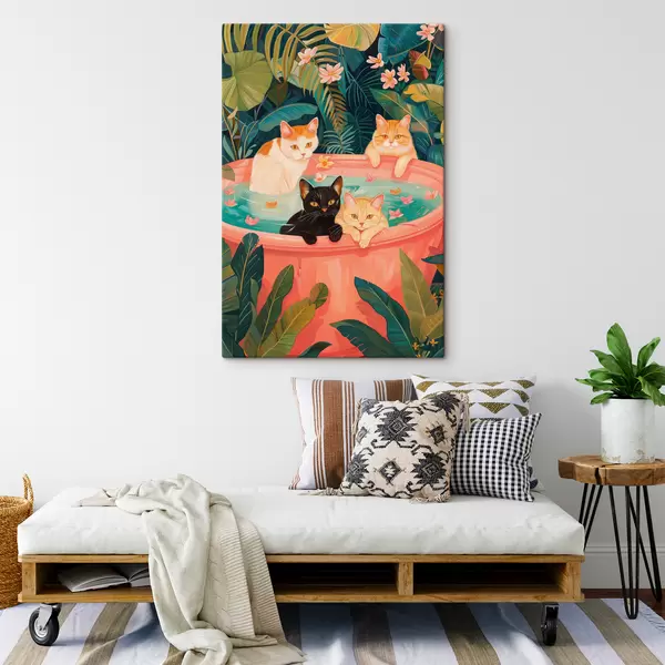 Wandbilder Katzen in einem rosa Bad mit grünen Blättern, Dschungelatmosphäre s39465
