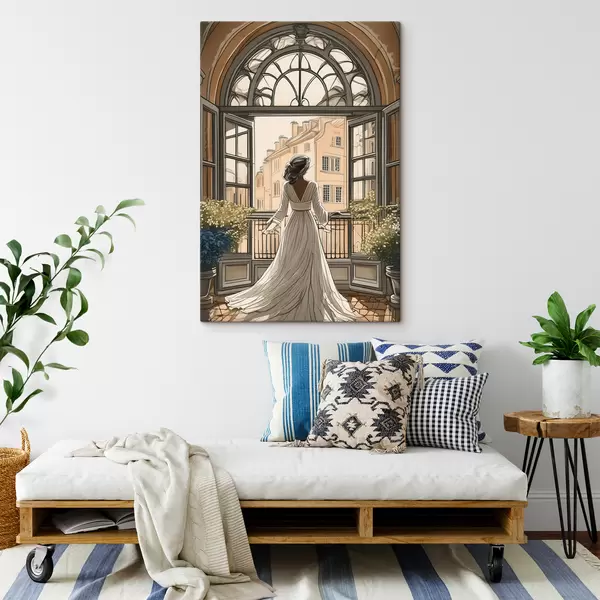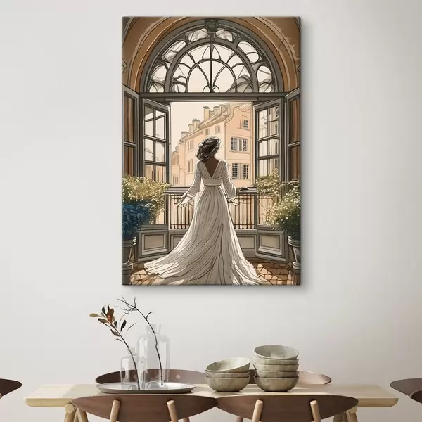 Wandbilder Silhouette eines Mädchens in einem weißen Kleid in der Nähe eines großen Fensters s39480