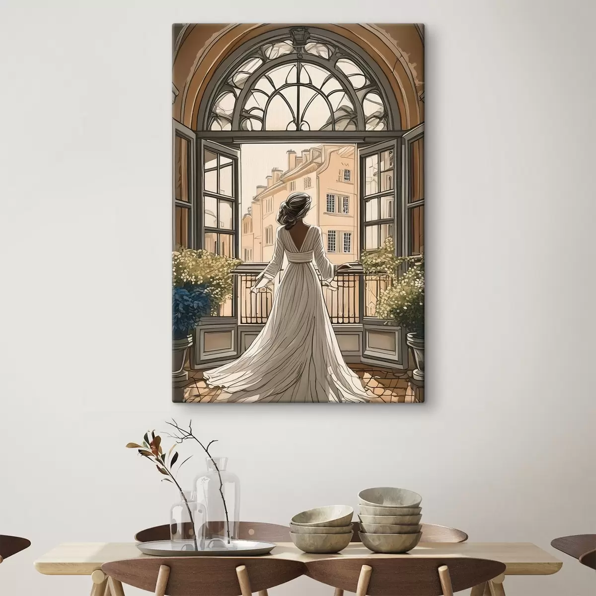 Wandbilder Silhouette eines Mädchens in einem weißen Kleid in der Nähe eines großen Fensters Art. s39480