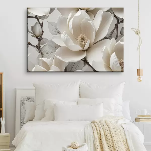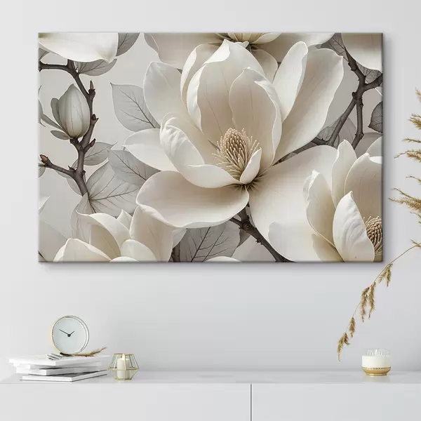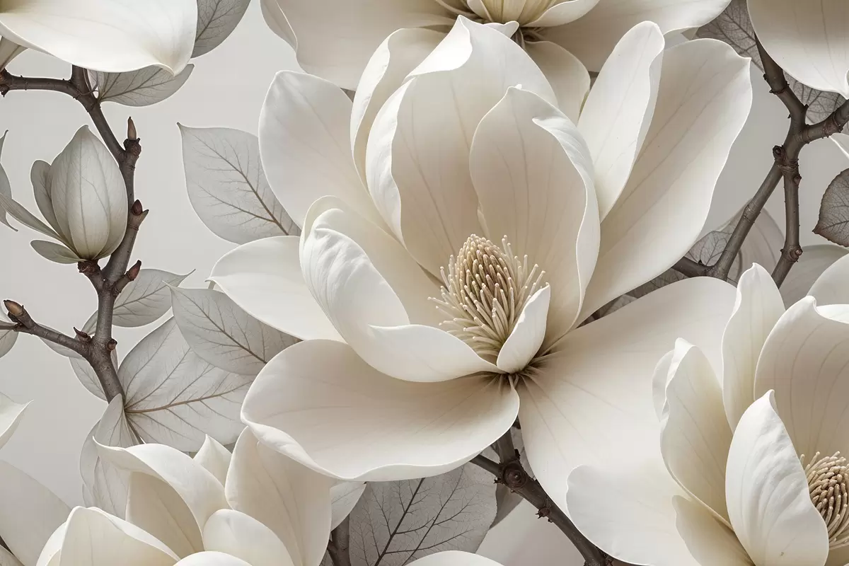 Wandbilder Weiße Magnolienblüte mit zarten Blütenblättern, umgeben von grünen Blättern vor hellem Hintergrund Art. s39527