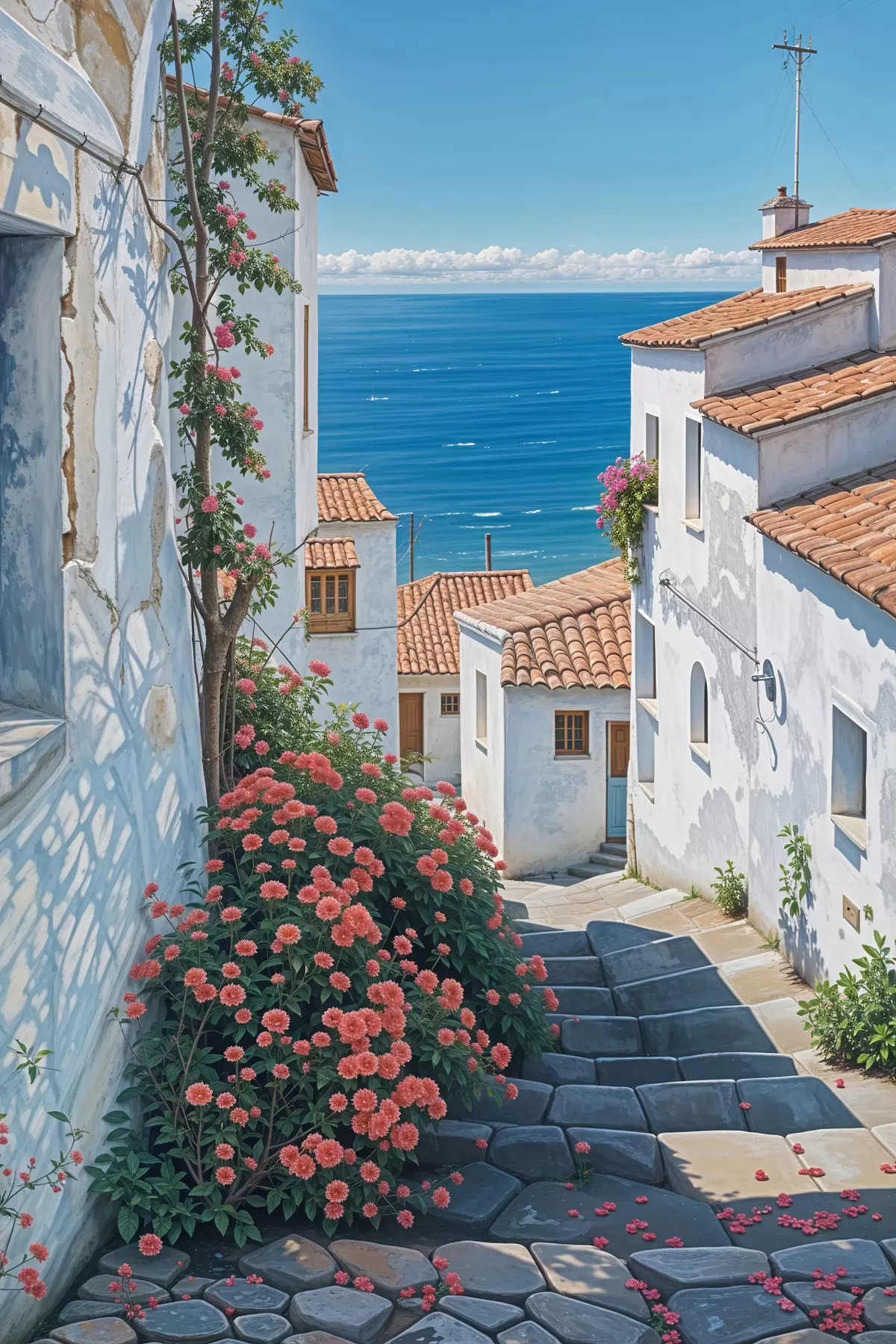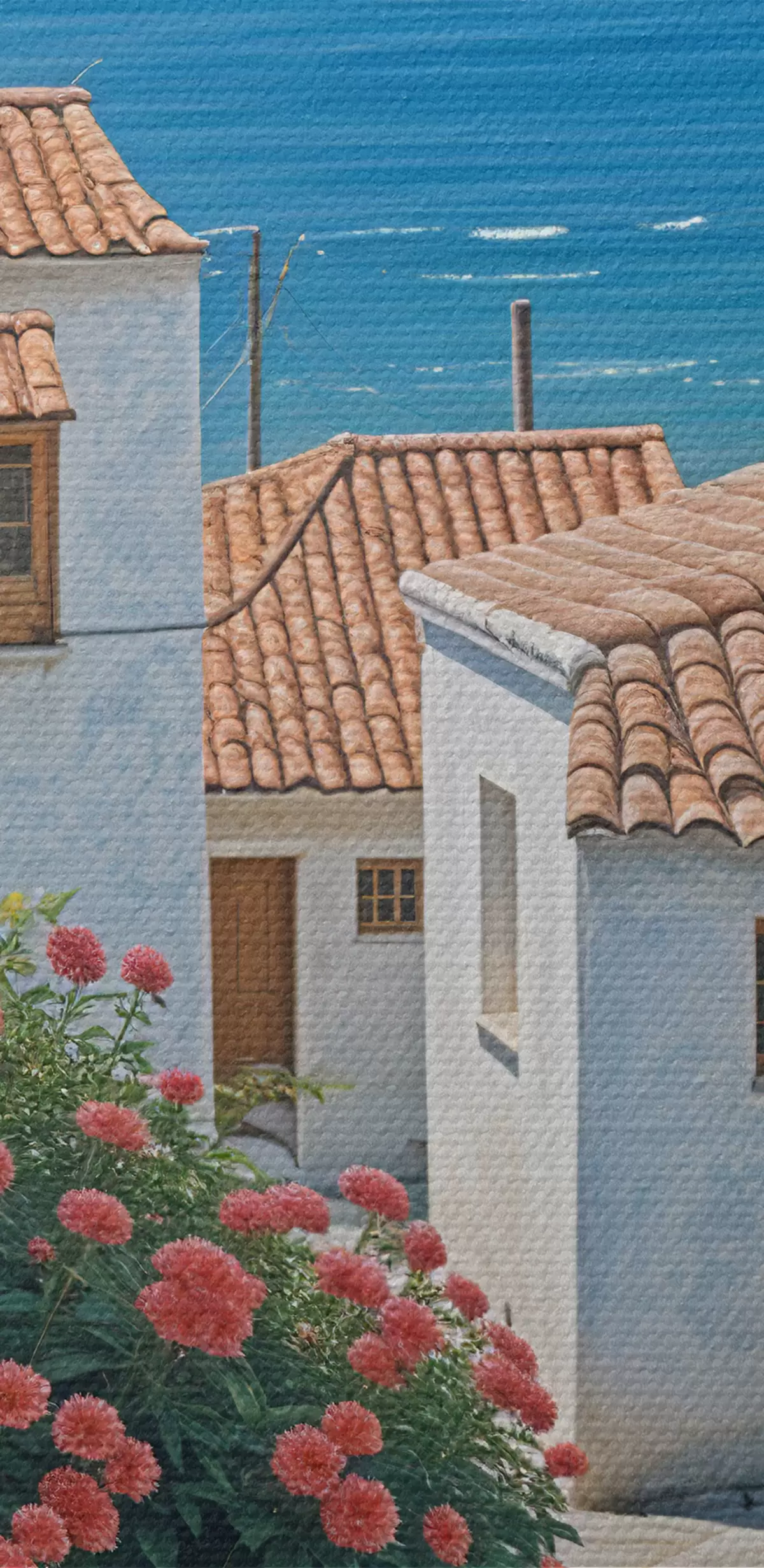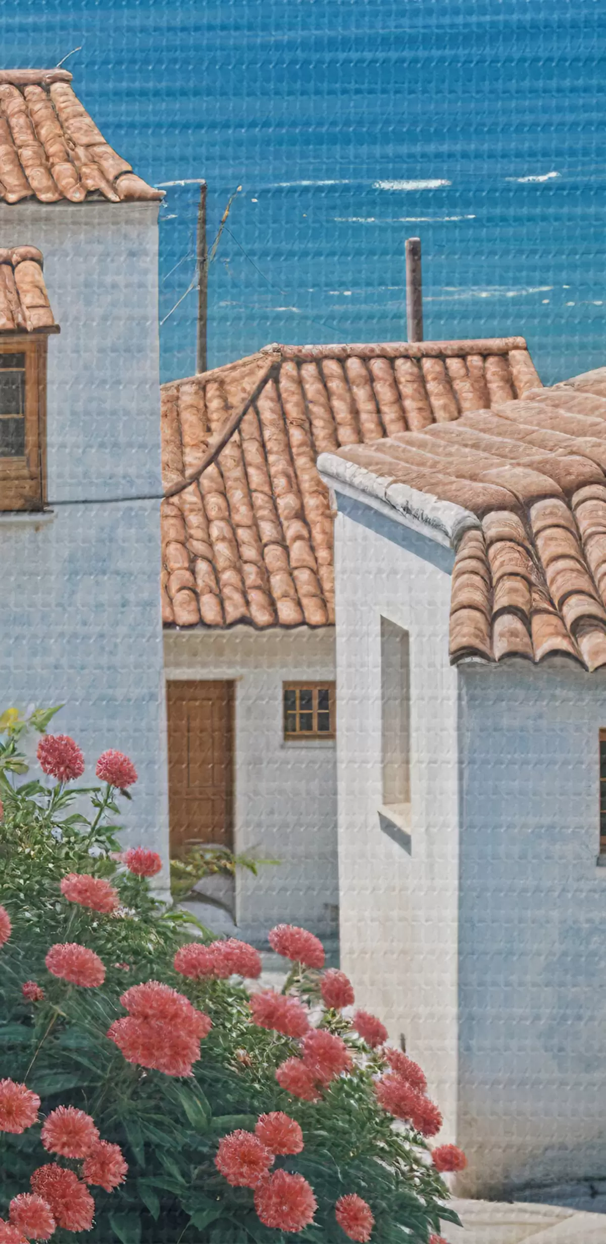 Wandbilder Eine schmale Straße in einer Küstenstadt mit weißen Gebäuden, roten Ziegeldächern und leuchtend rosa Blumen s39532