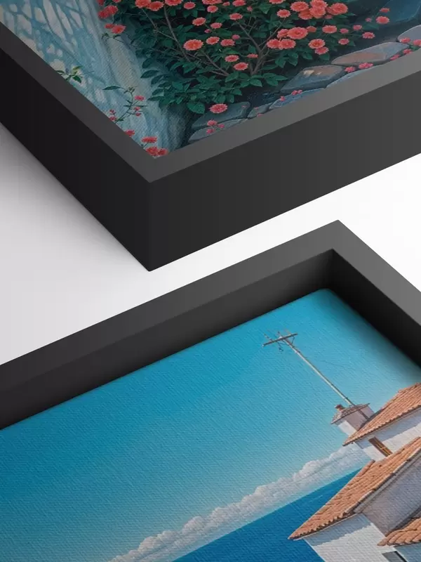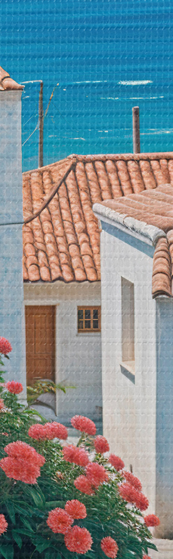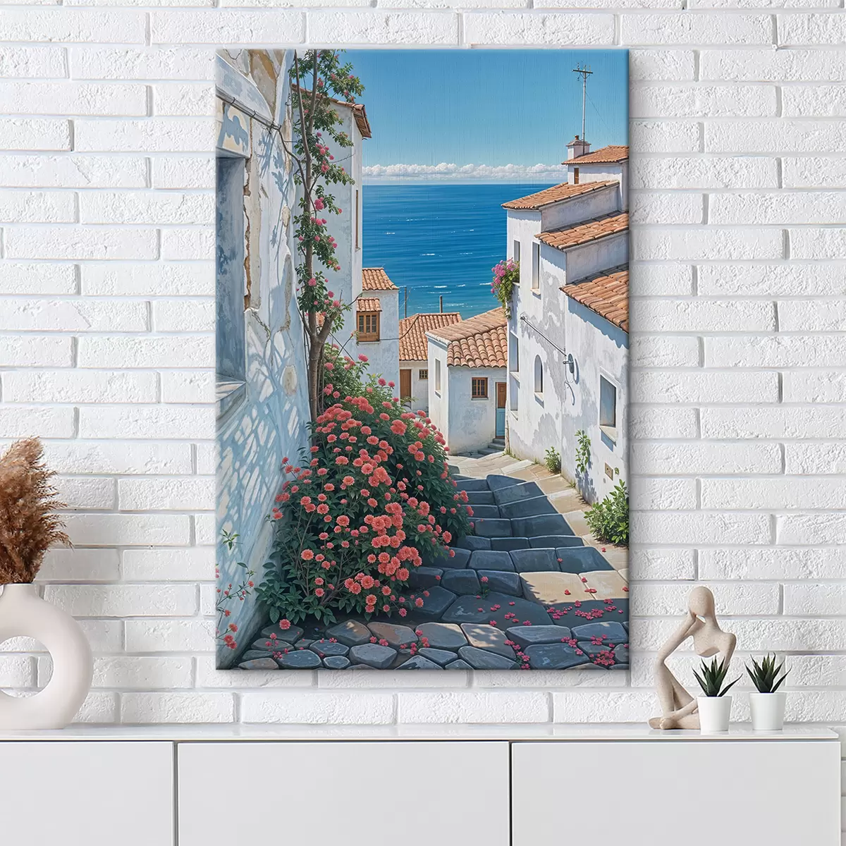 Wandbilder Eine schmale Straße in einer Küstenstadt mit weißen Gebäuden, roten Ziegeldächern und leuchtend rosa Blumen Art. s39532