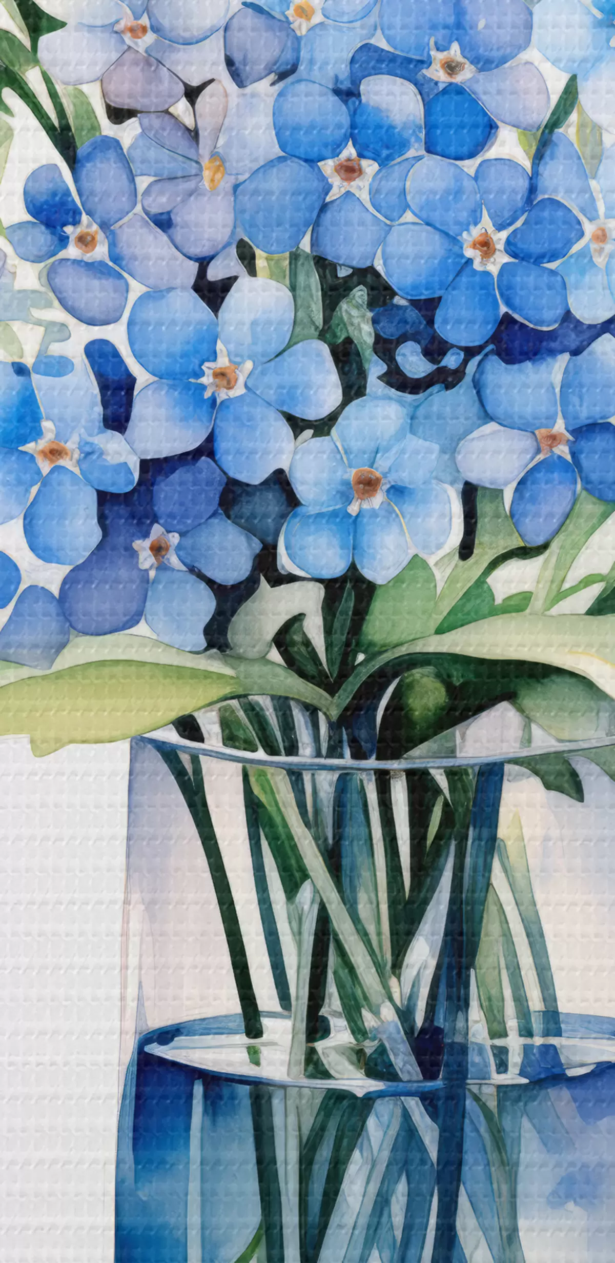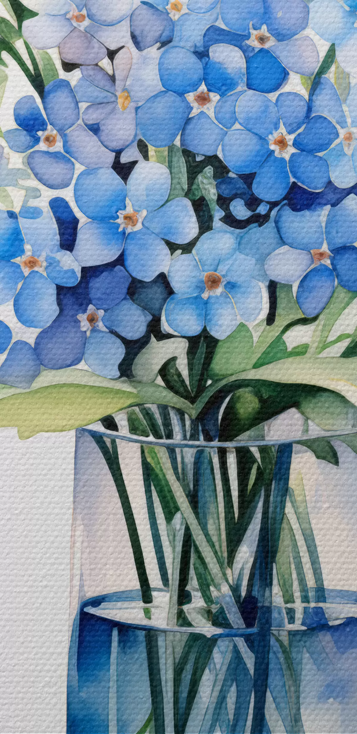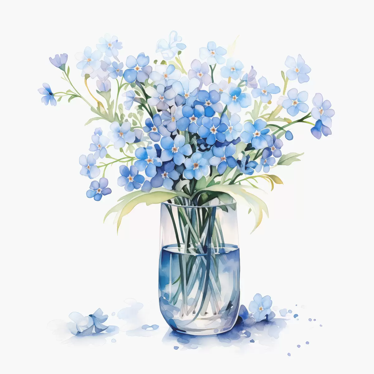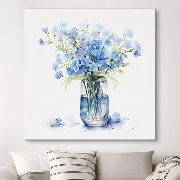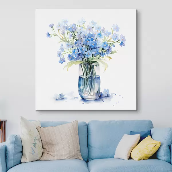 Wandbilder Blumenstrauß aus blauen Wildblumen in einer transparenten Vase Aquarell Art. s39564