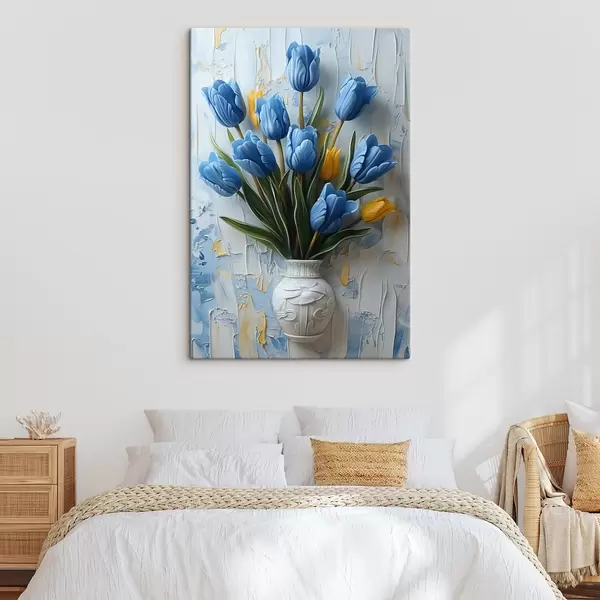 Wandbilder Blaue und gelbe Tulpen in 3D: elegantes ölgemaltes Wandbild mit weißem und hellblauem Hintergrund und gravierter Vase s39637