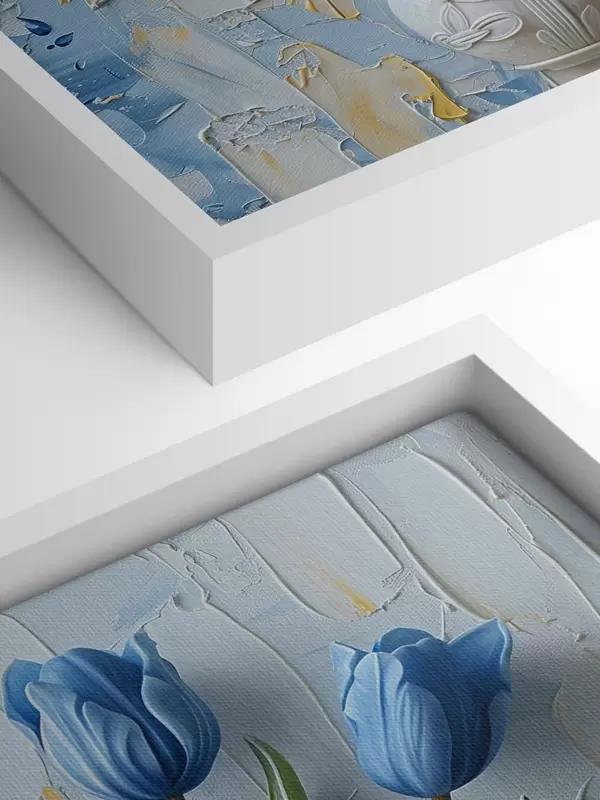 Wandbilder Blaue und gelbe Tulpen in 3D: elegantes ölgemaltes Wandbild mit weißem und hellblauem Hintergrund und gravierter Vase Art. s39637