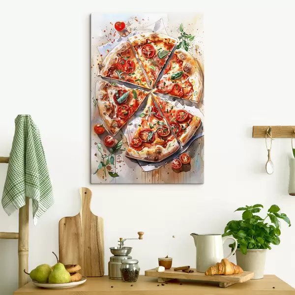 Wandbilder Aquarellpizza, lecker, Tomaten und Käse, Lebensmittelkunst, Holztisch Art. s39704