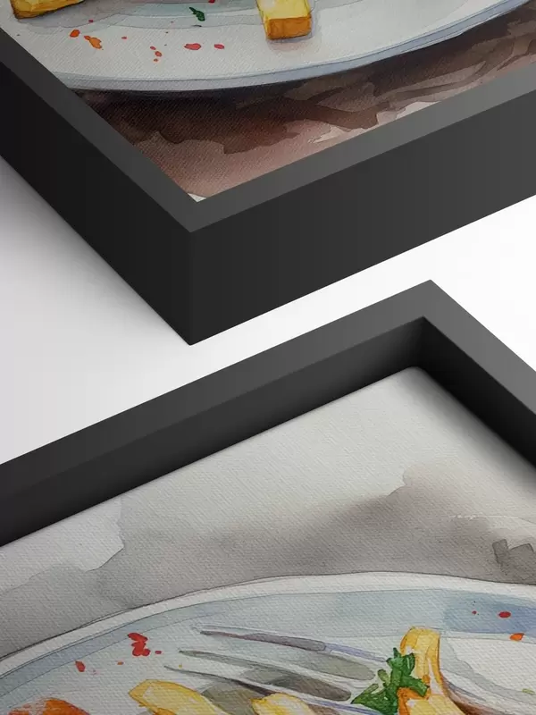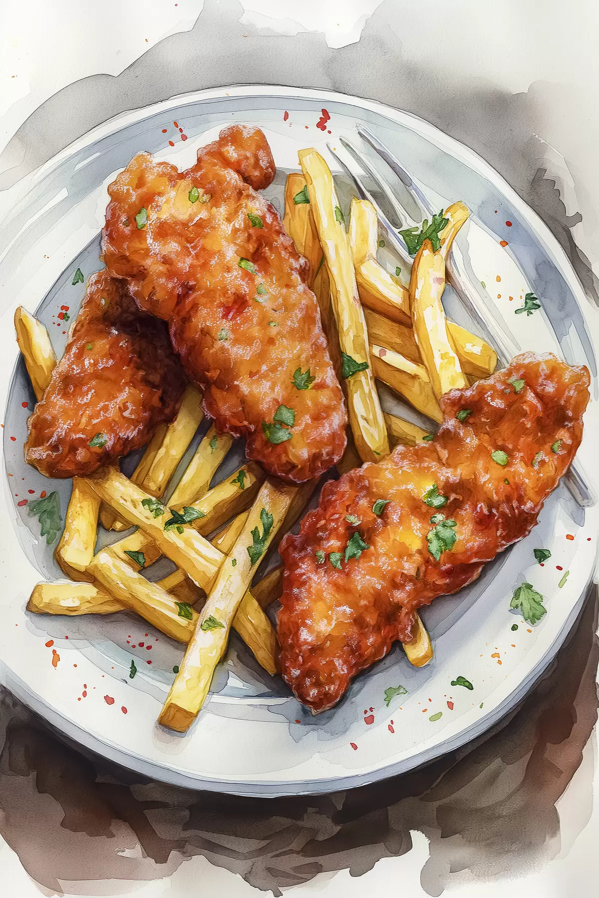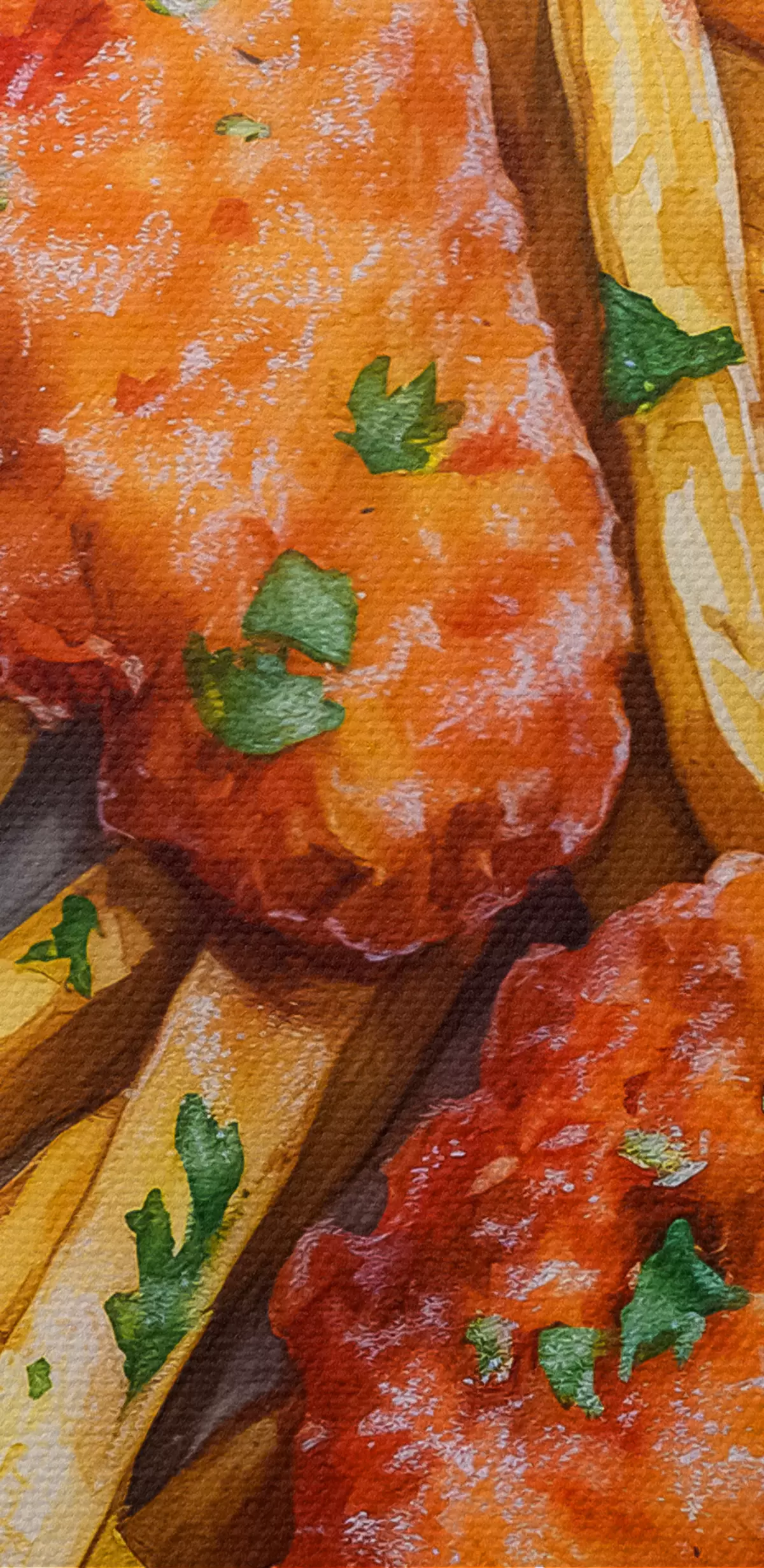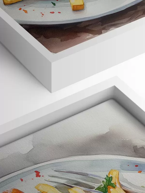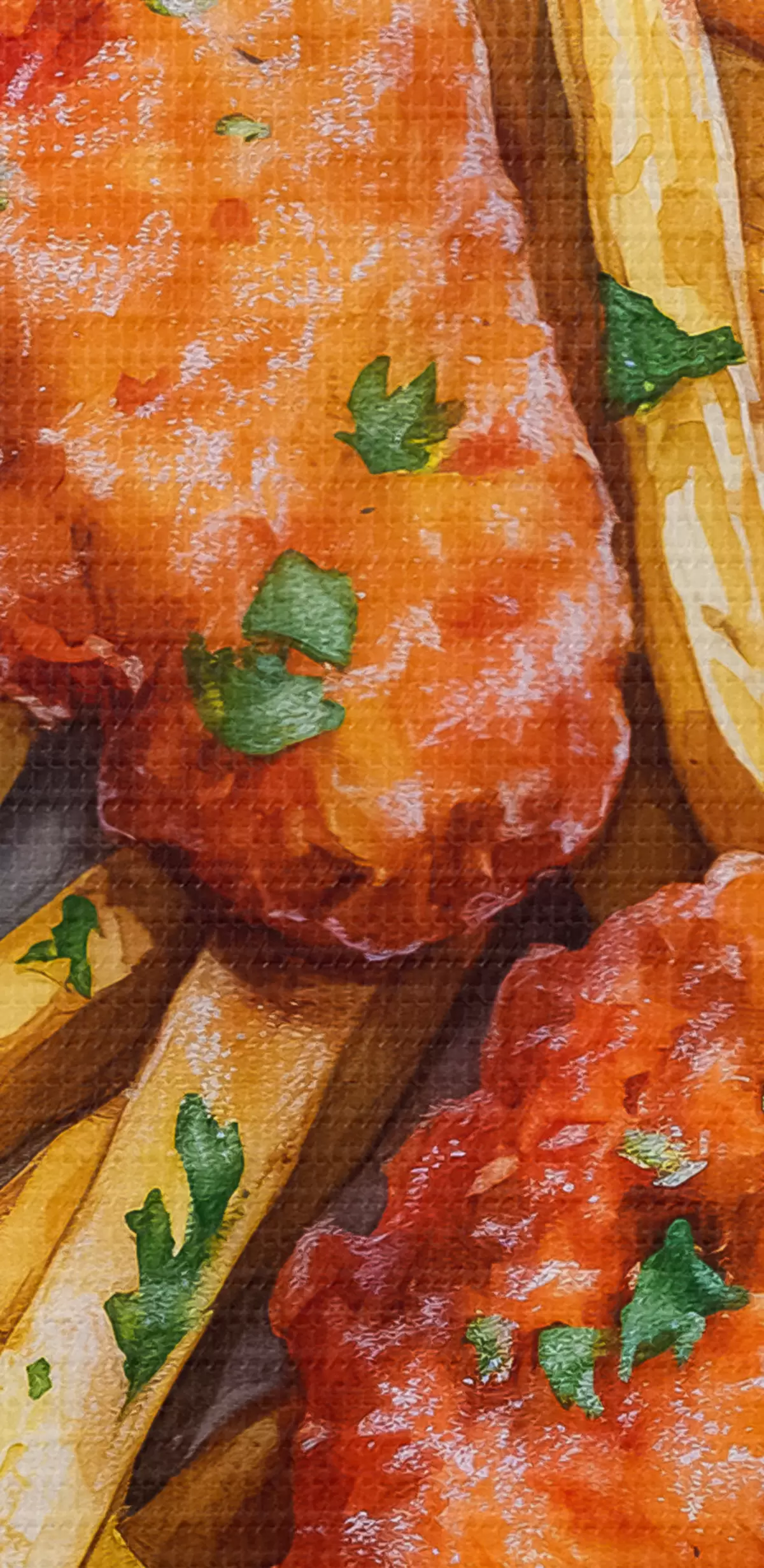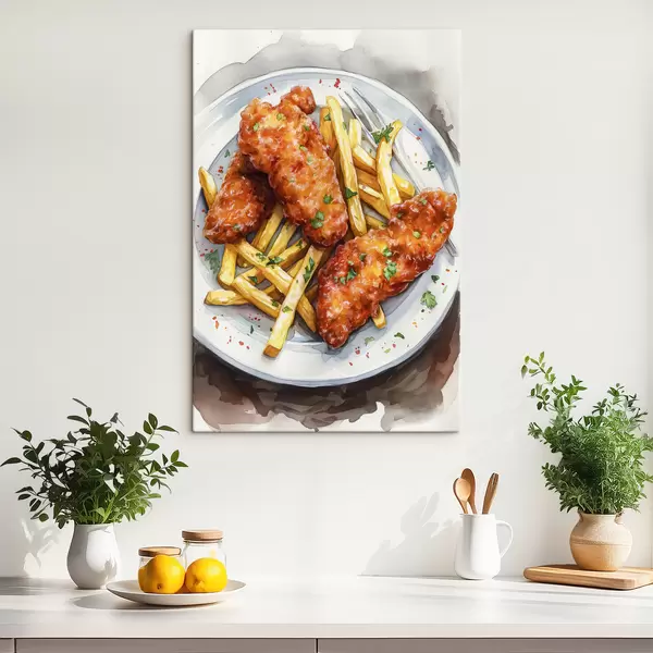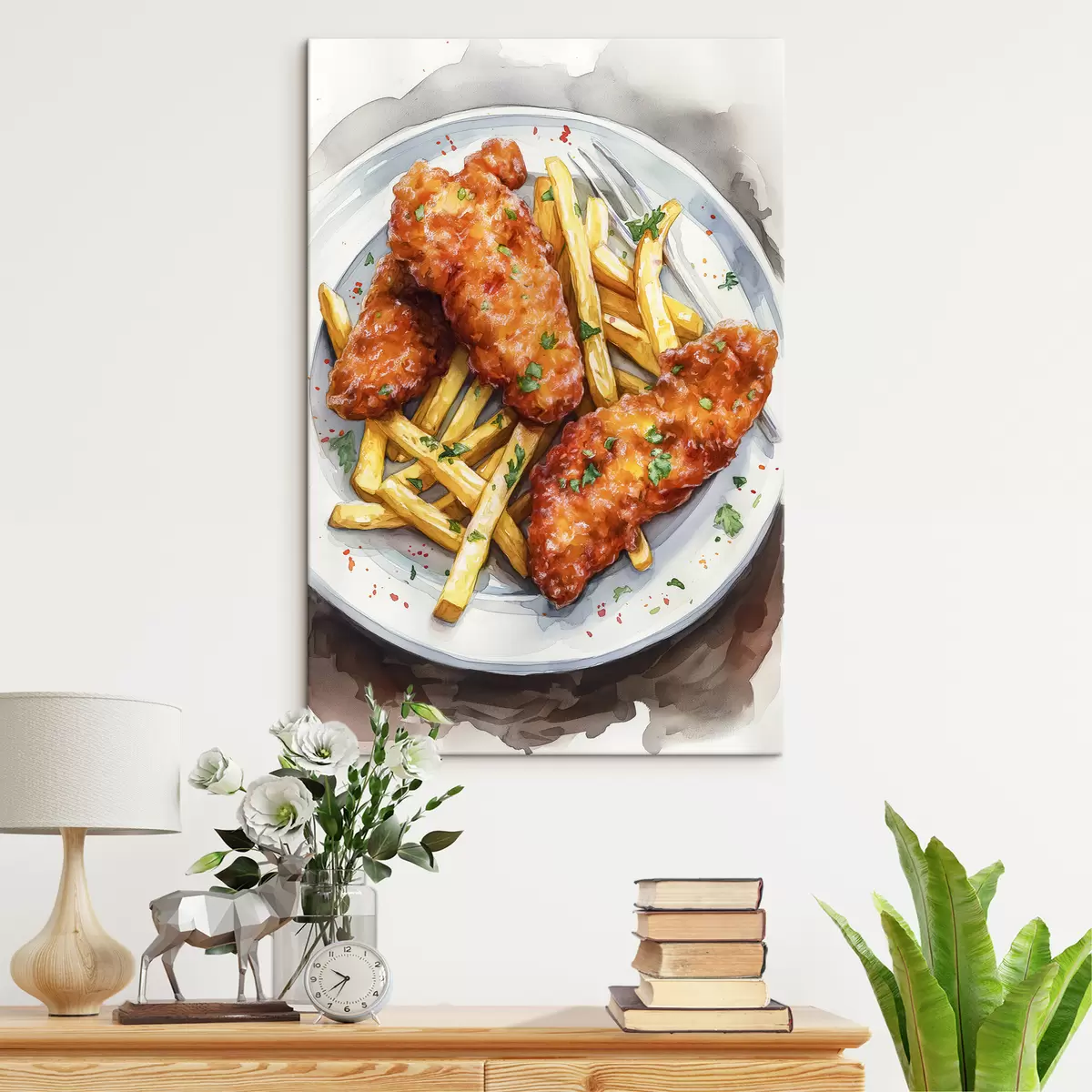 Wandbilder Aquarell-Food-Art, Pommes Frites mit gebratenem Huhn, köstlich Art. s39708