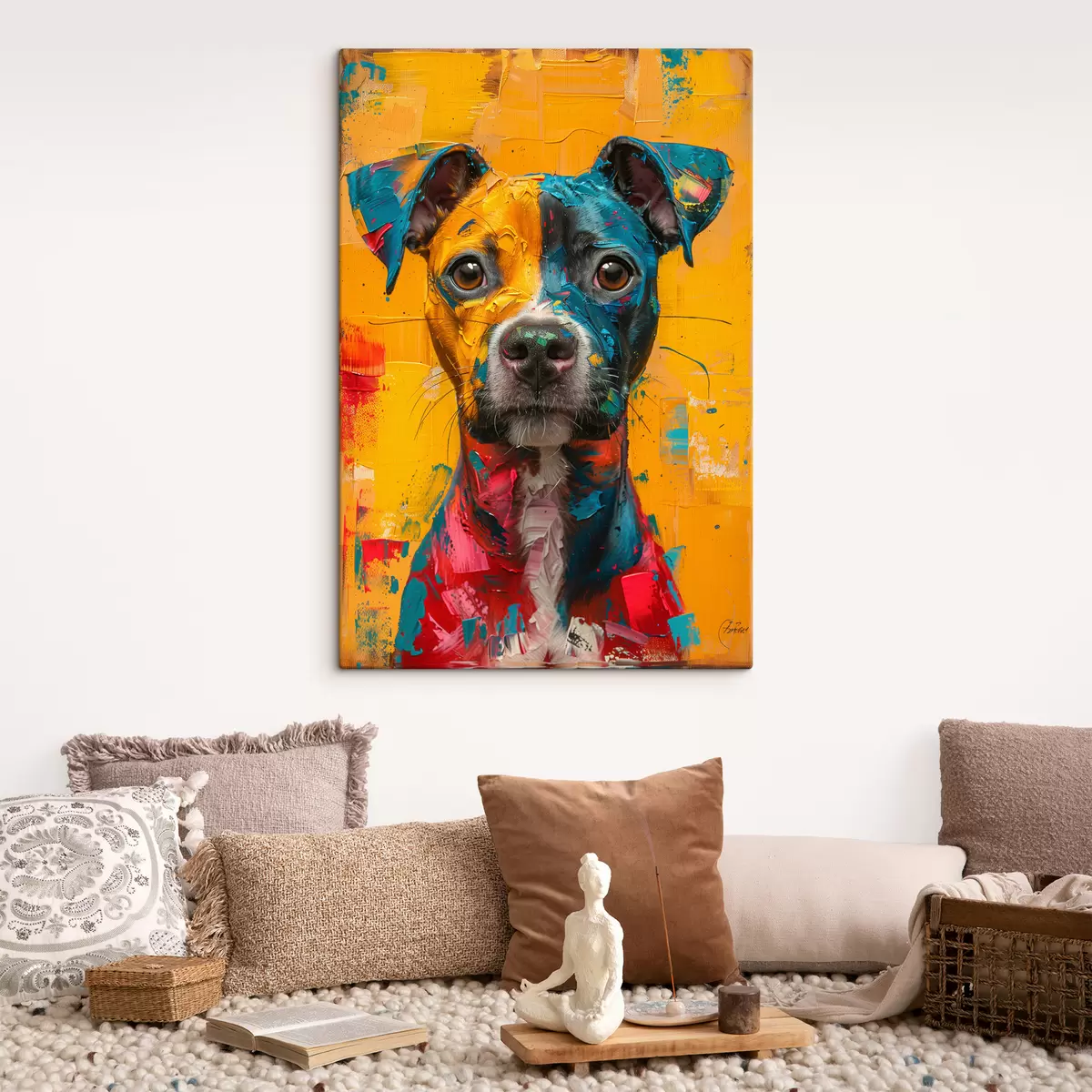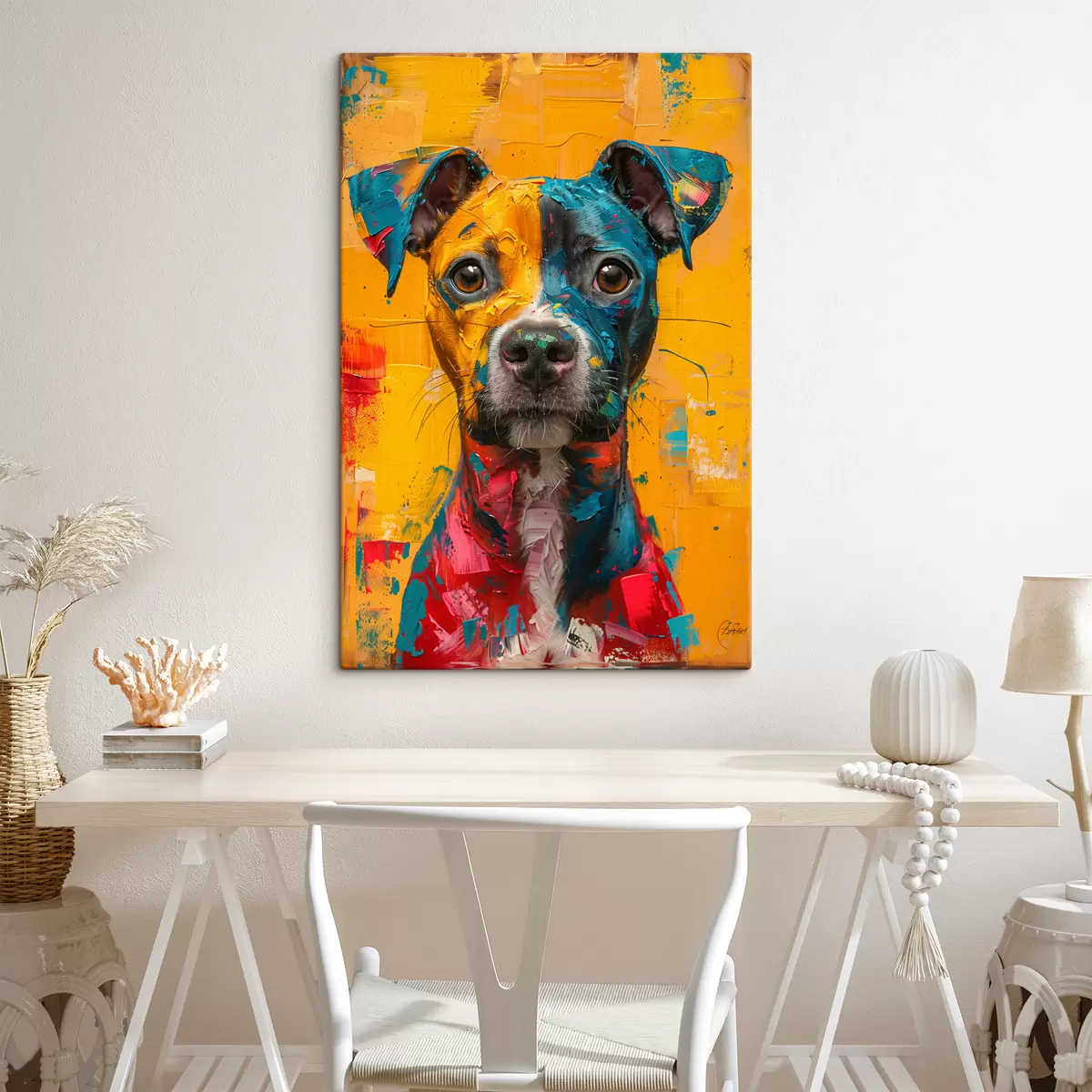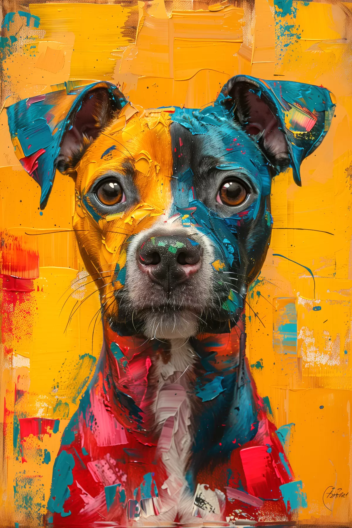 Wandbilder Porträt eines Pitbull mit gelben und blauen Ölpinselstrichen s39722