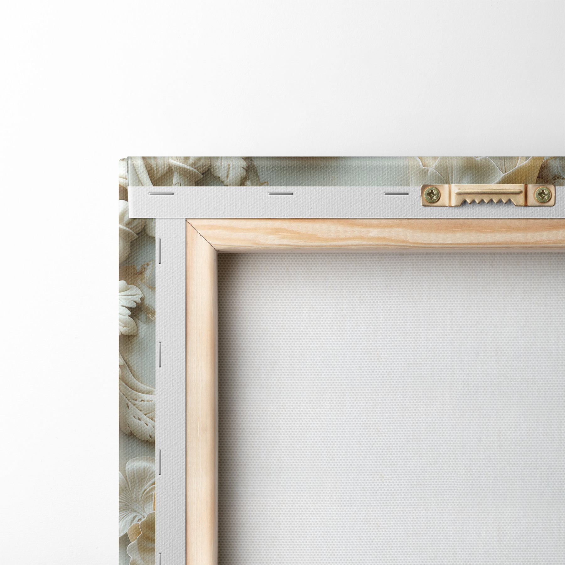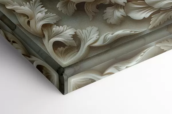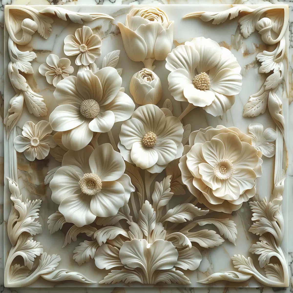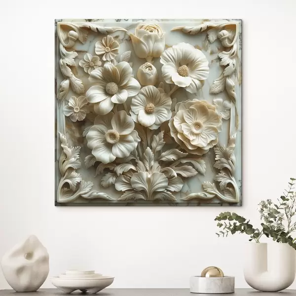 Wandbilder 3D-weiße Flachreliefblumen auf Marmorhintergrund mit Rahmen Art. s39739