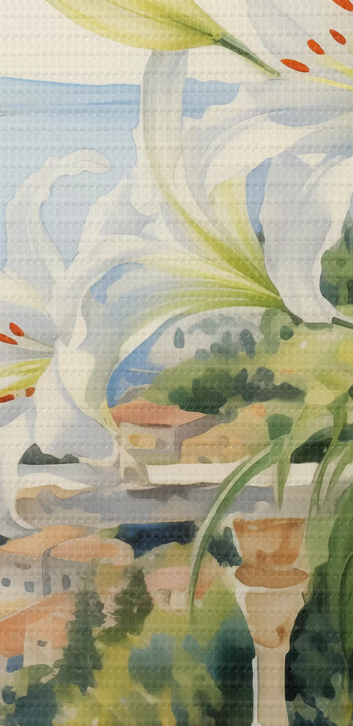 Wandbilder Weiße Lilien in einem Topf auf einem Balkon vor dem Hintergrund der Bucht Aquarell s39932