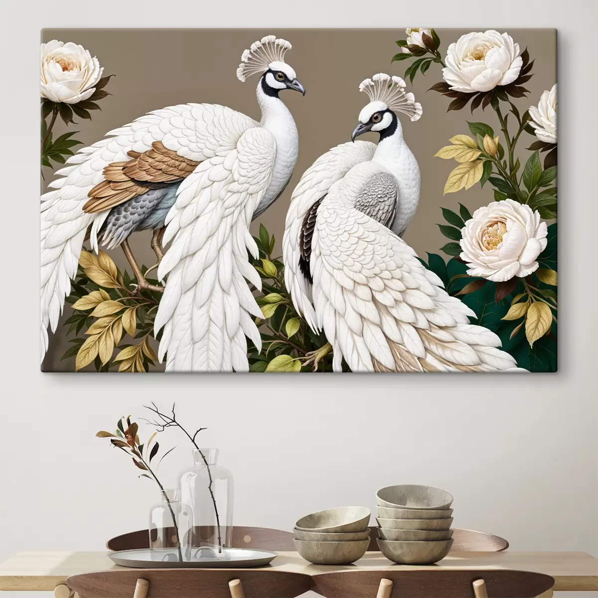 Wandbilder Zwei weiße Pfauen mit verzierten Federn sitzen auf einem Ast mit Blumen Art. s40022