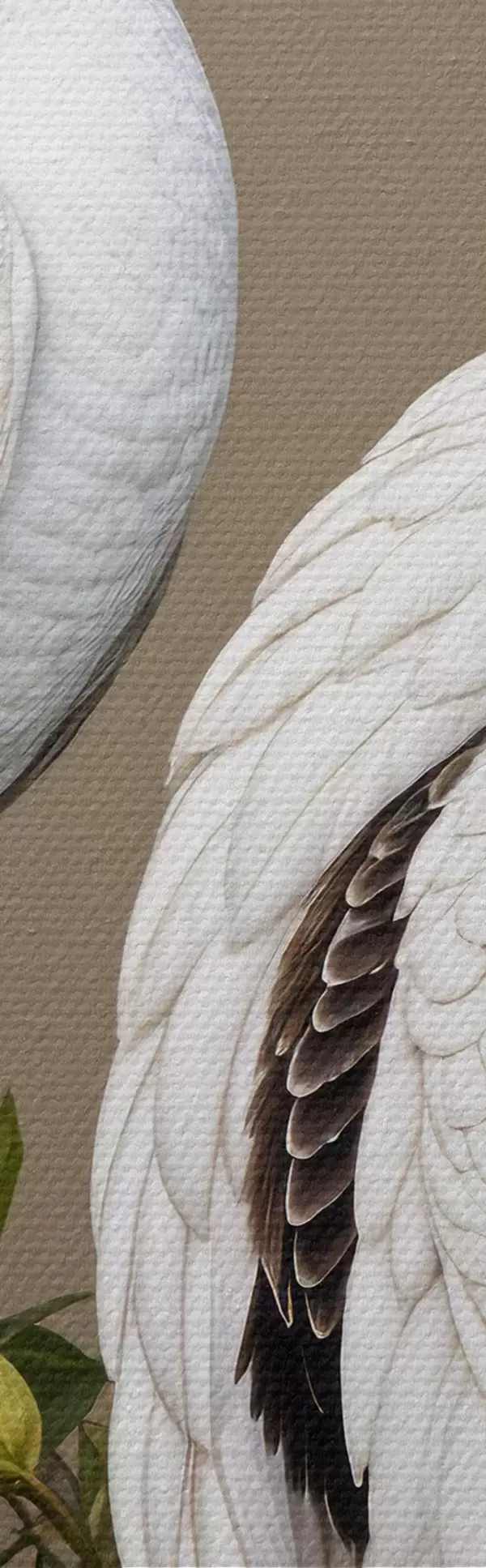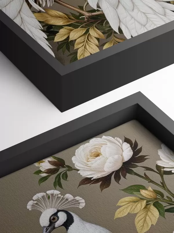Wandbilder Zwei weiße Pfauen mit verzierten Federn sitzen auf einem Ast mit Blumen s40022