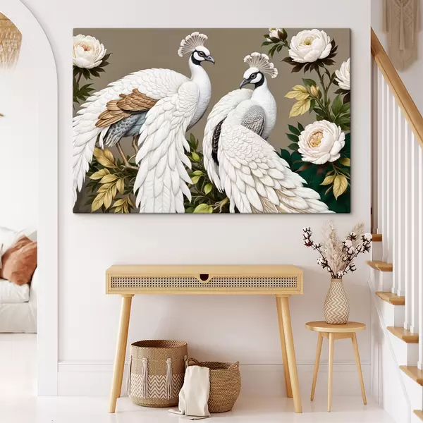 Wandbilder Zwei weiße Pfauen mit verzierten Federn sitzen auf einem Ast mit Blumen Art. s40022