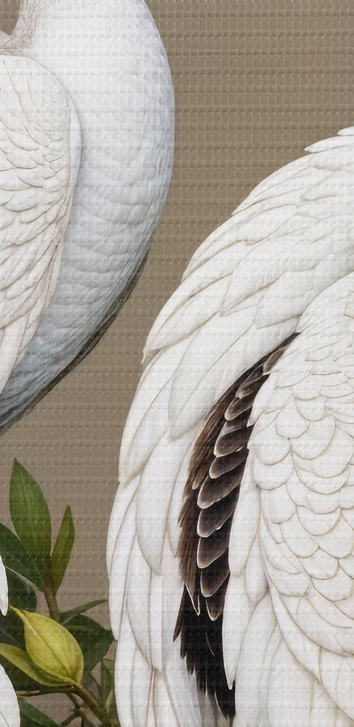 Wandbilder Zwei weiße Pfauen mit verzierten Federn sitzen auf einem Ast mit Blumen s40022