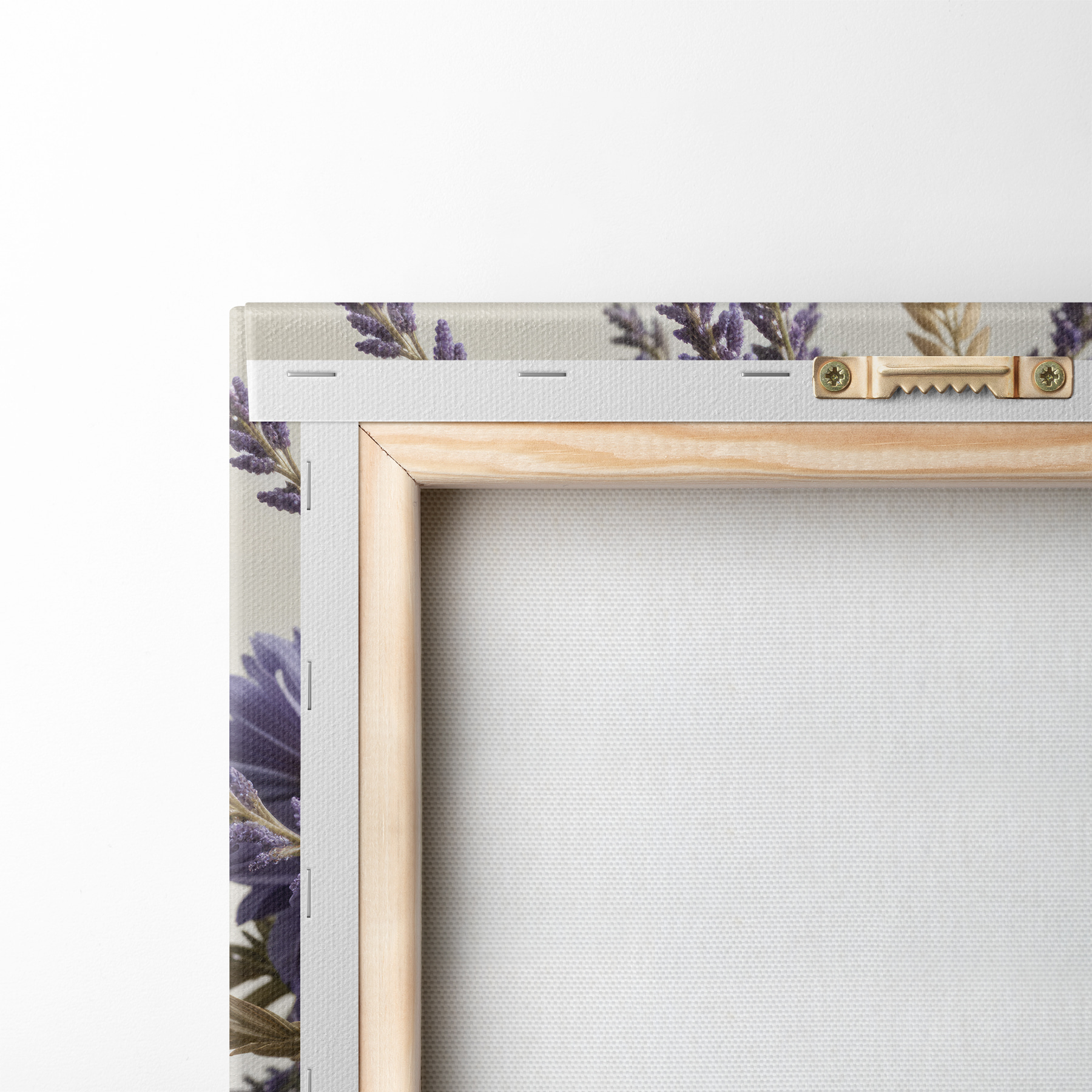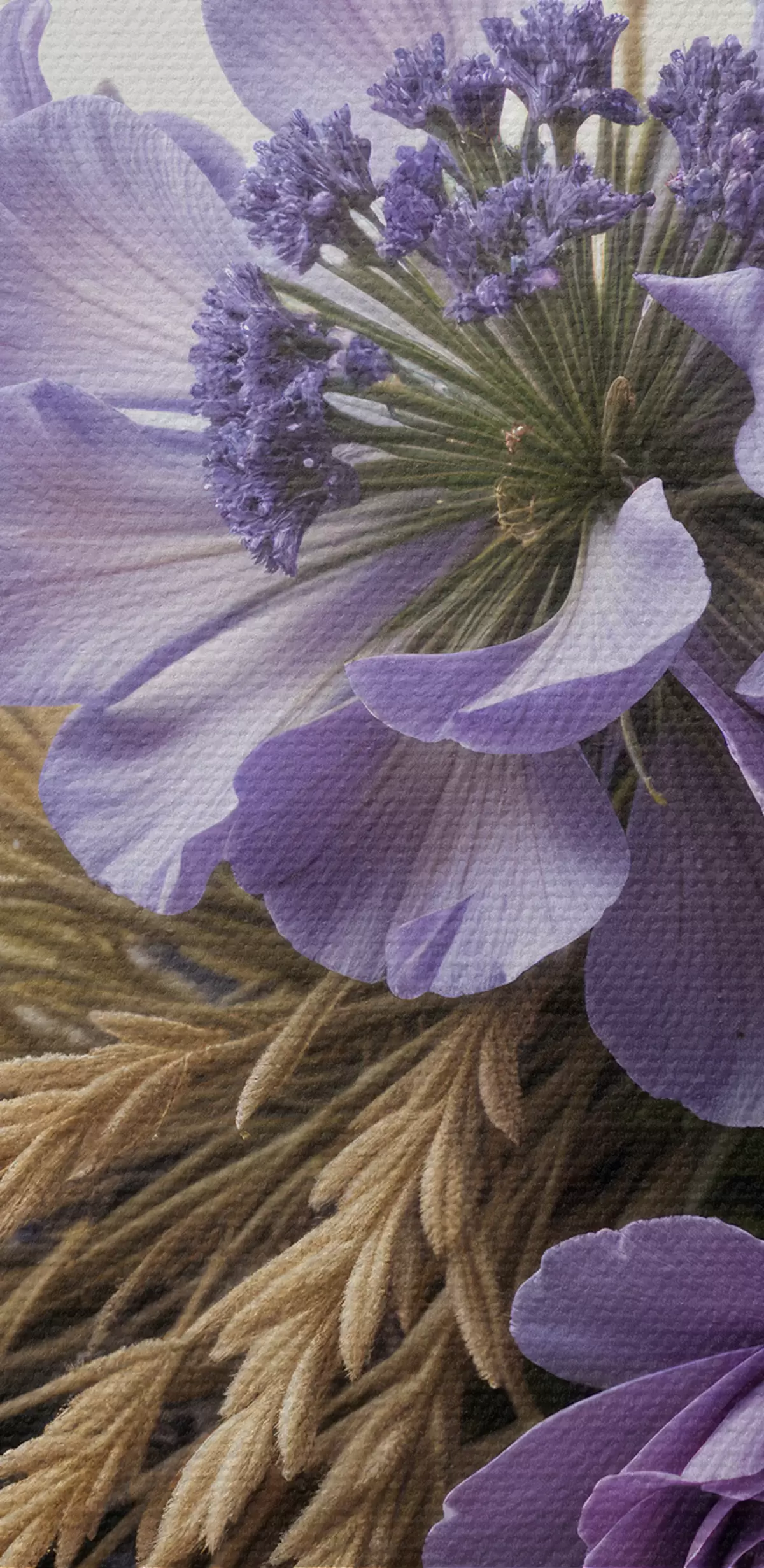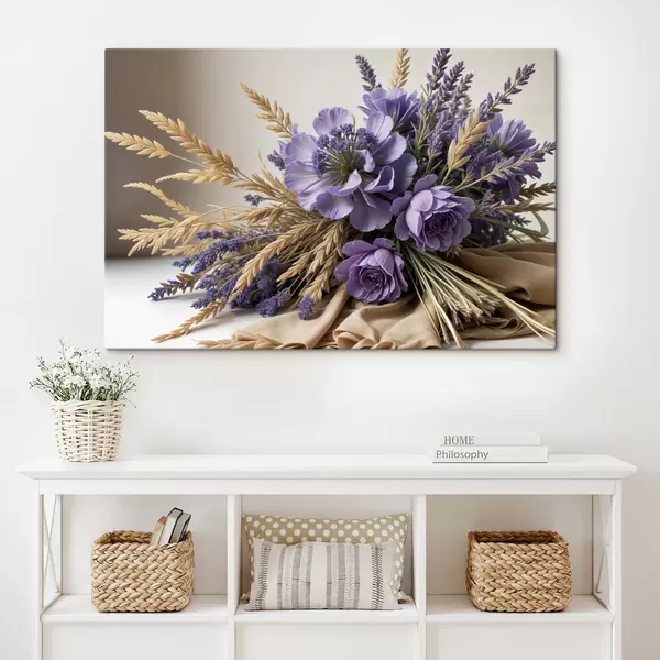 Wandbilder Ein Strauß violetter Blumen, darunter Pfingstrosen und Lavendel, mit Weizenhalmen auf hellem Hintergrund Art. s40030