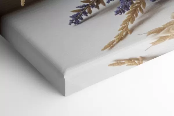 Wandbilder Ein Strauß violetter Blumen, darunter Pfingstrosen und Lavendel, mit Weizenhalmen auf hellem Hintergrund Art. s40030