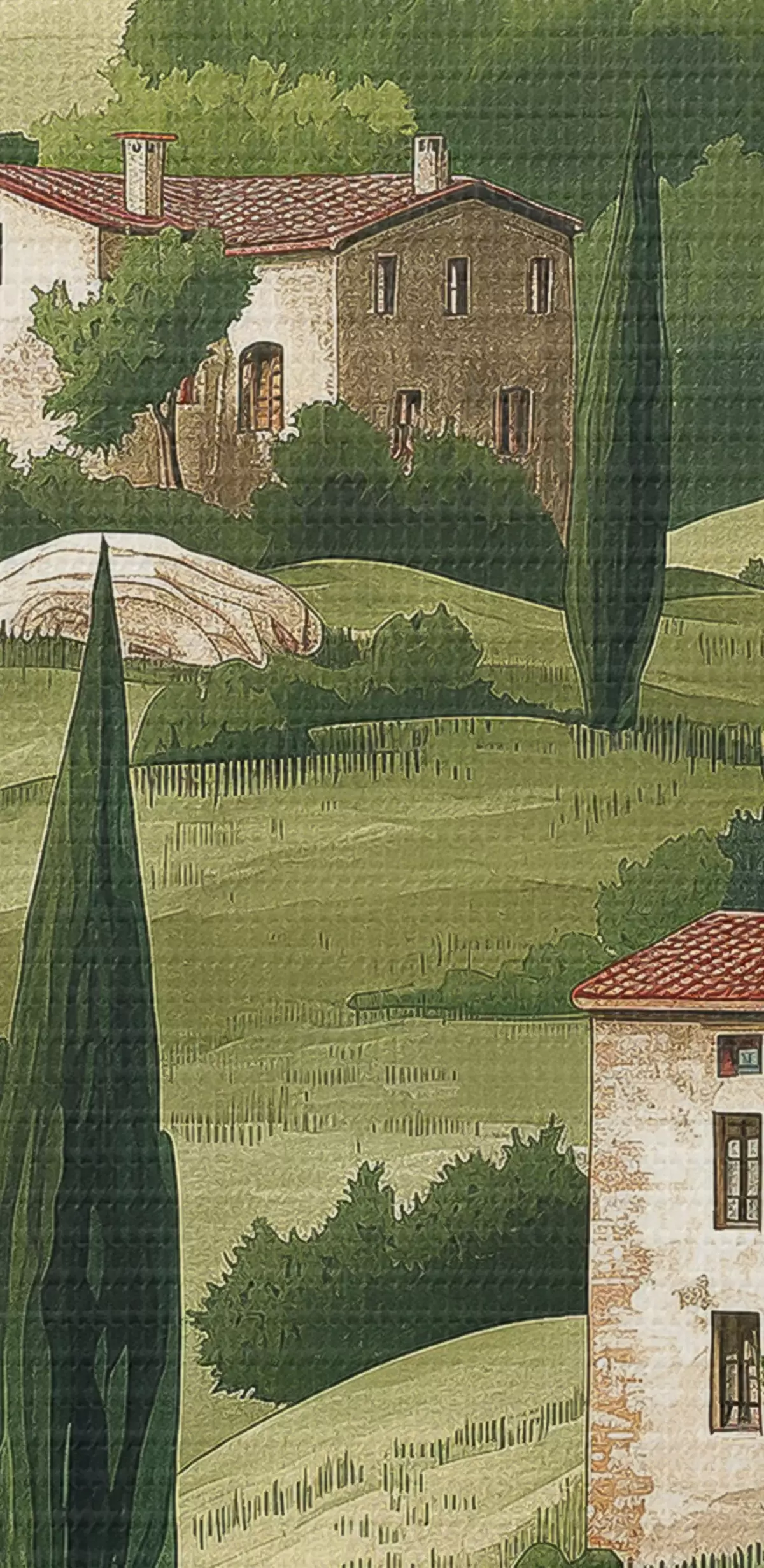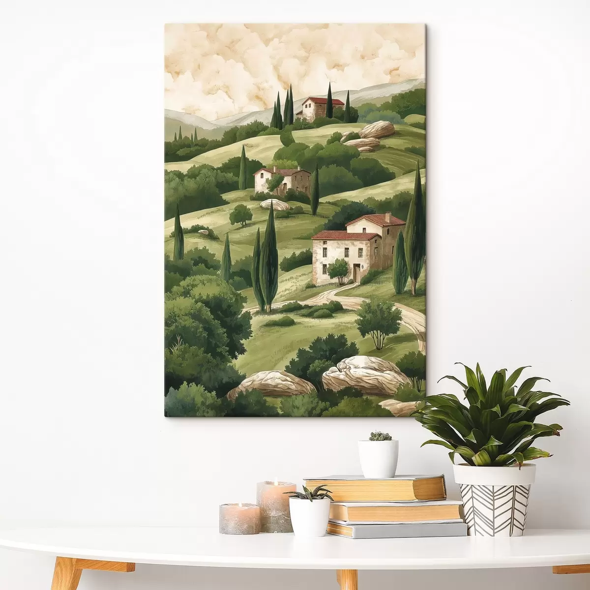 Wandbilder Landschaft mit Vintage-Häusern, pastellgrüne Farben, Acrylzeichnung, rustikal s40080