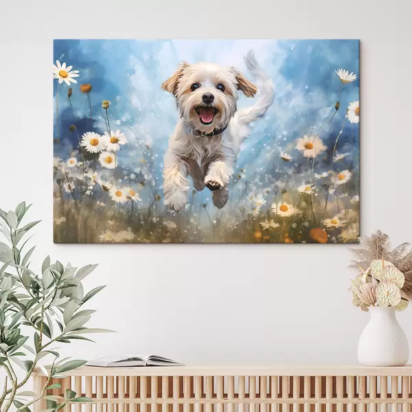 Wandbilder Kleiner weißer Hund springt zwischen Gänseblümchen auf blauem Hintergrund Aquarell Art. s40092