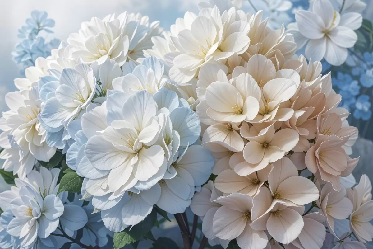 Wandbilder Zarte, pastellfarbene Dahlienblüten mit zarten Blütenblättern blühen vor einem unscharfen Hintergrund s40146