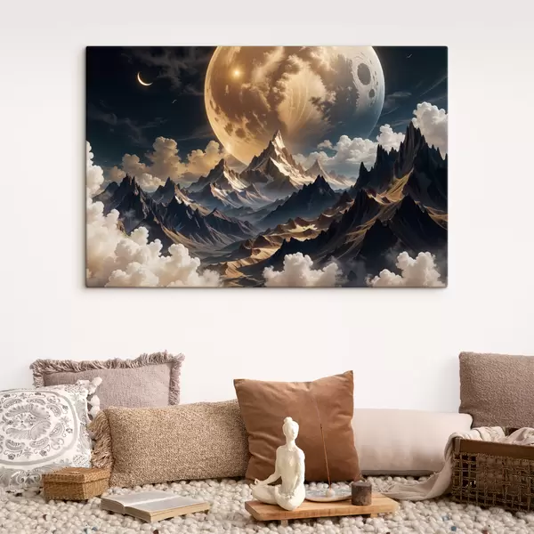 Wandbilder Eine surreale Landschaft mit schneebedeckten Bergen unter einem riesigen Vollmond, mit dünnen Wolken Art. s40147
