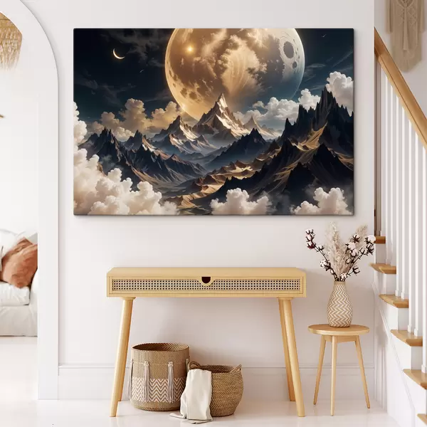 Wandbilder Eine surreale Landschaft mit schneebedeckten Bergen unter einem riesigen Vollmond, mit dünnen Wolken Art. s40147
