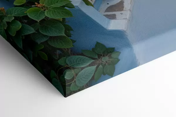 Wandbilder Eine malerische Küstenstadt mit weißen Gebäuden, blauen Fenstern und Topfpflanzen entlang der engen Gassen s40148