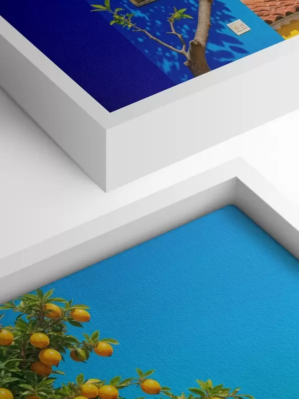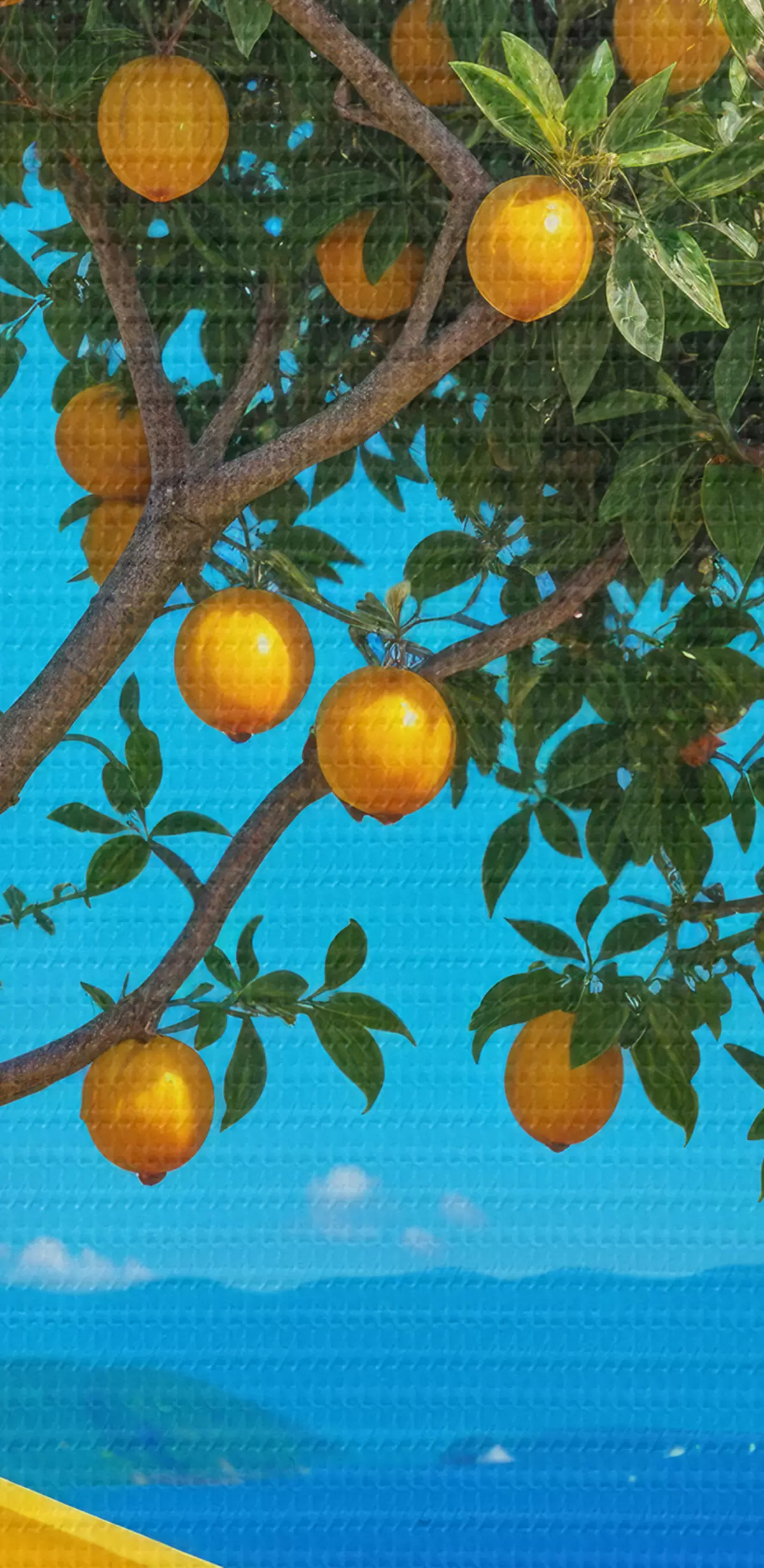 Wandbilder Ein Orangenbaum mit reifen Früchten wächst auf einem Gebäude mit blauer Wand und Ziegeldach mit Blick auf den Ozean Art. s40159