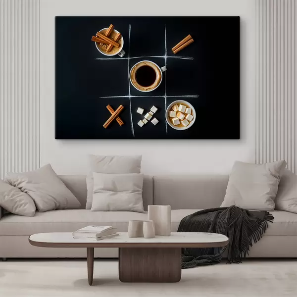 Wandbilder Eine Tasse Kaffee mit Zimtstangen, Zuckerwürfeln und Marshmallows, angeordnet in einem Tic-Tac-Toe-Raster Art. s40163