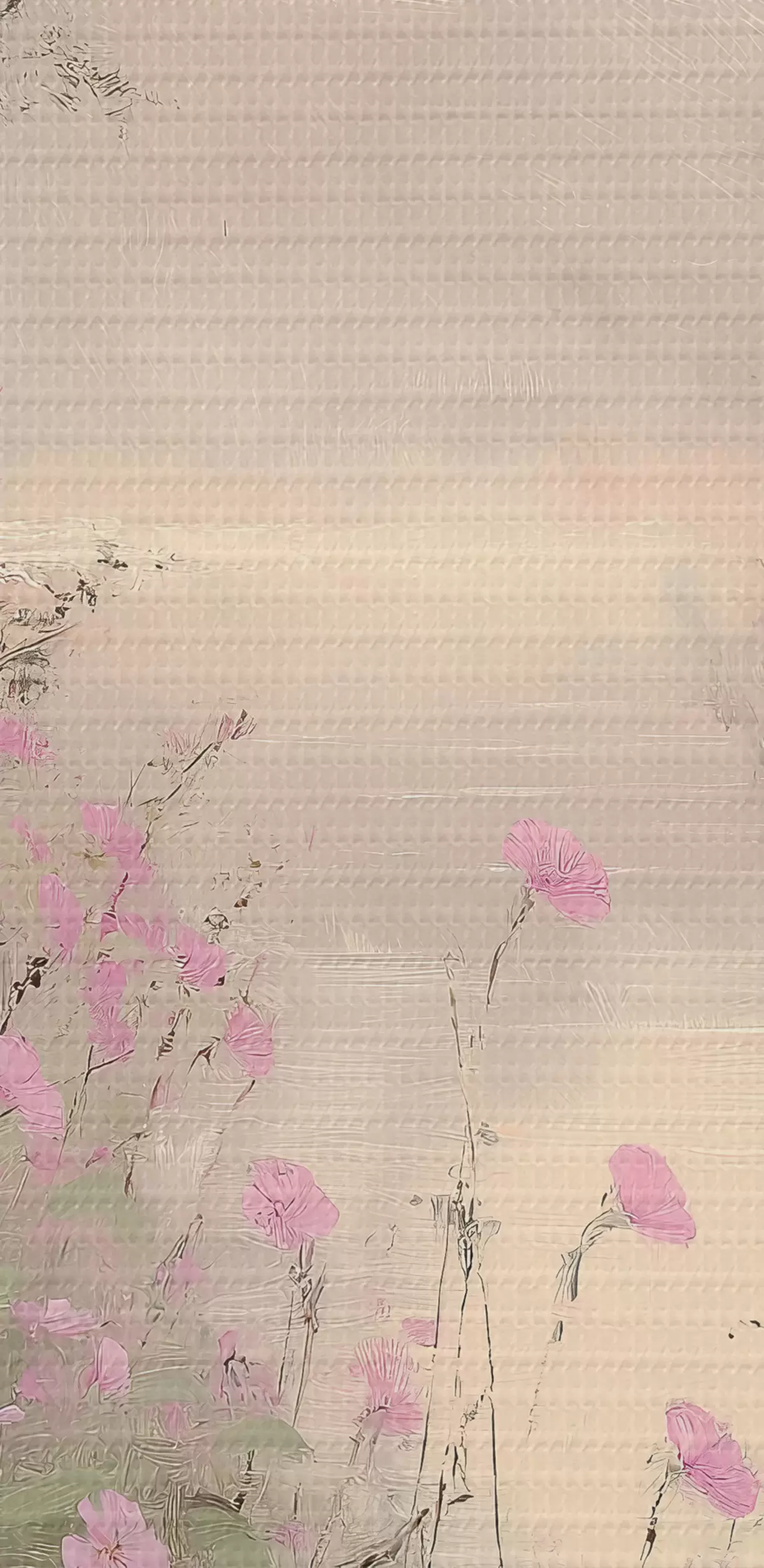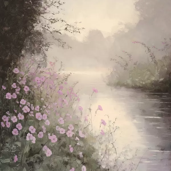 Wandbilder See mit rosa Blumen, Sonnenaufgang, Ölzeichnung, pastellbeige Farben, Nebel Art. s40229