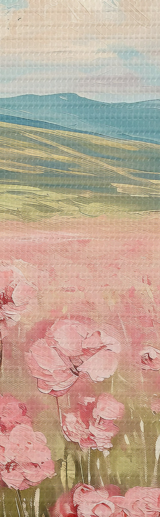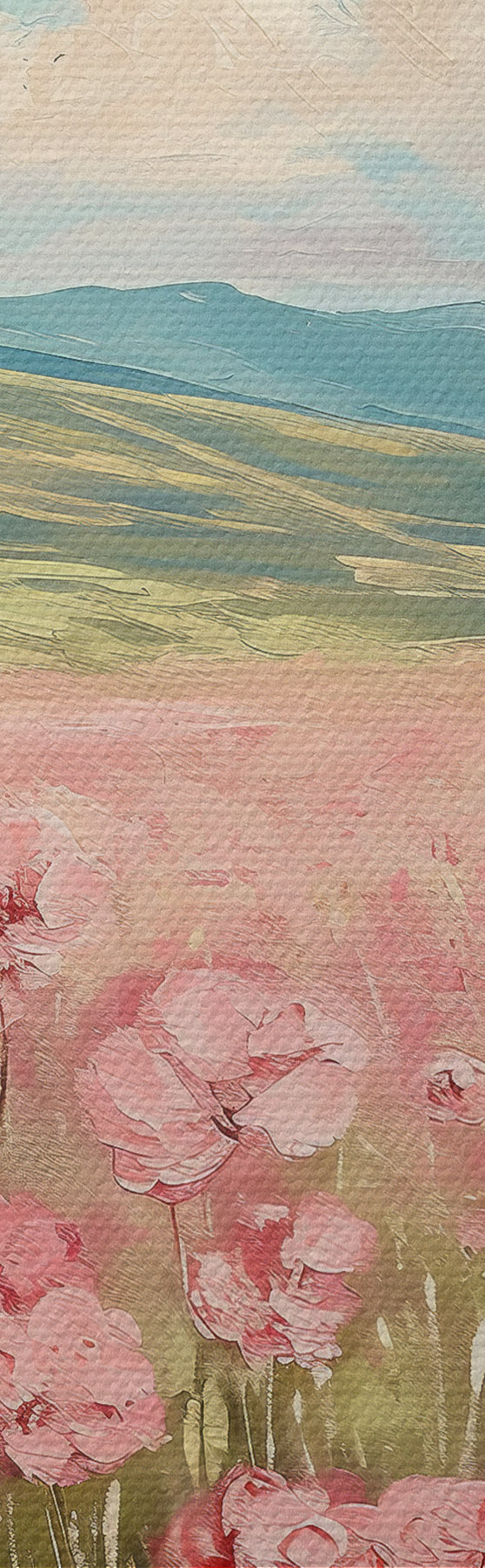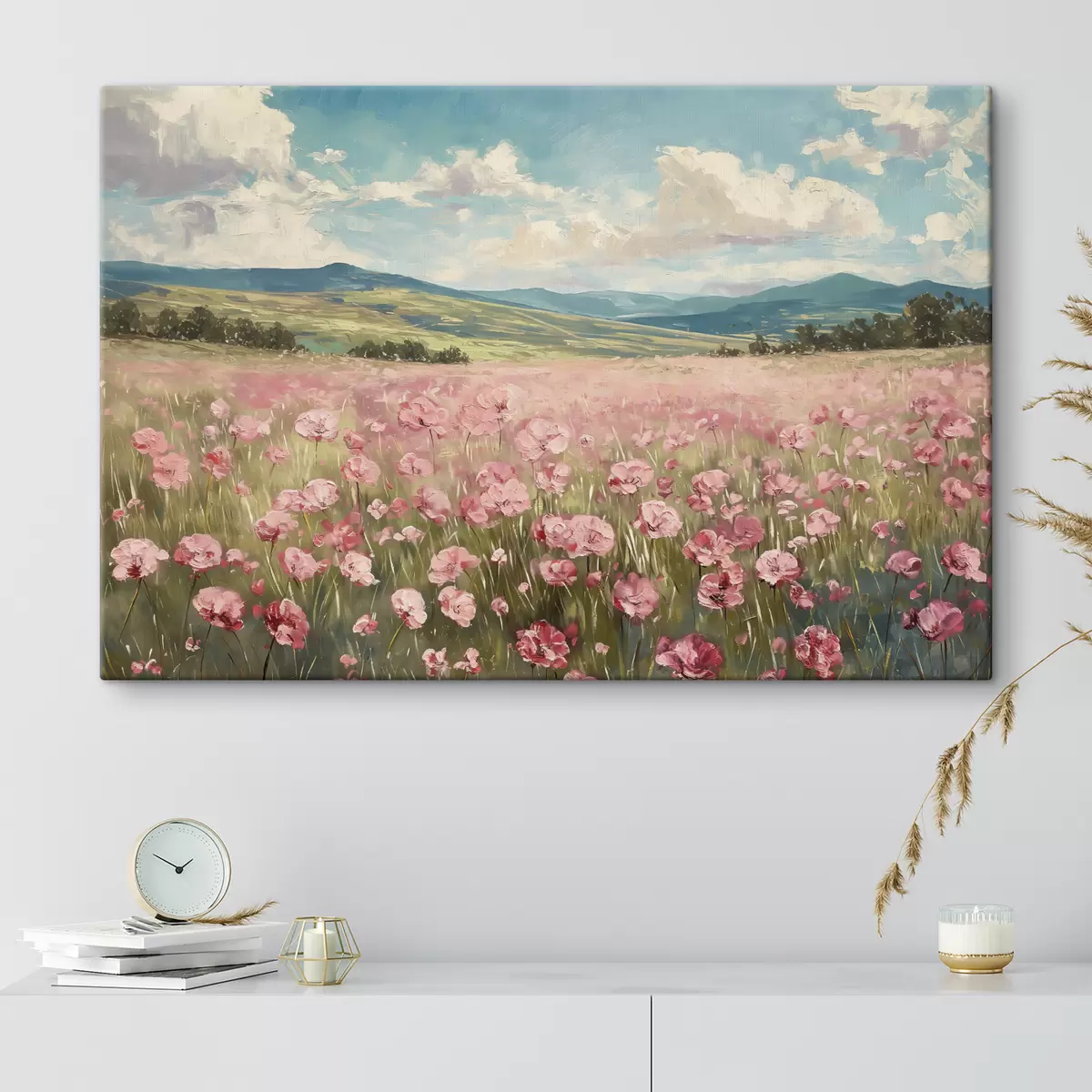 Wandbilder Wiese mit rosa Blumen, Berge, Naturlandschaft, blauer Himmel mit Wolken, Acryl Art. s40232