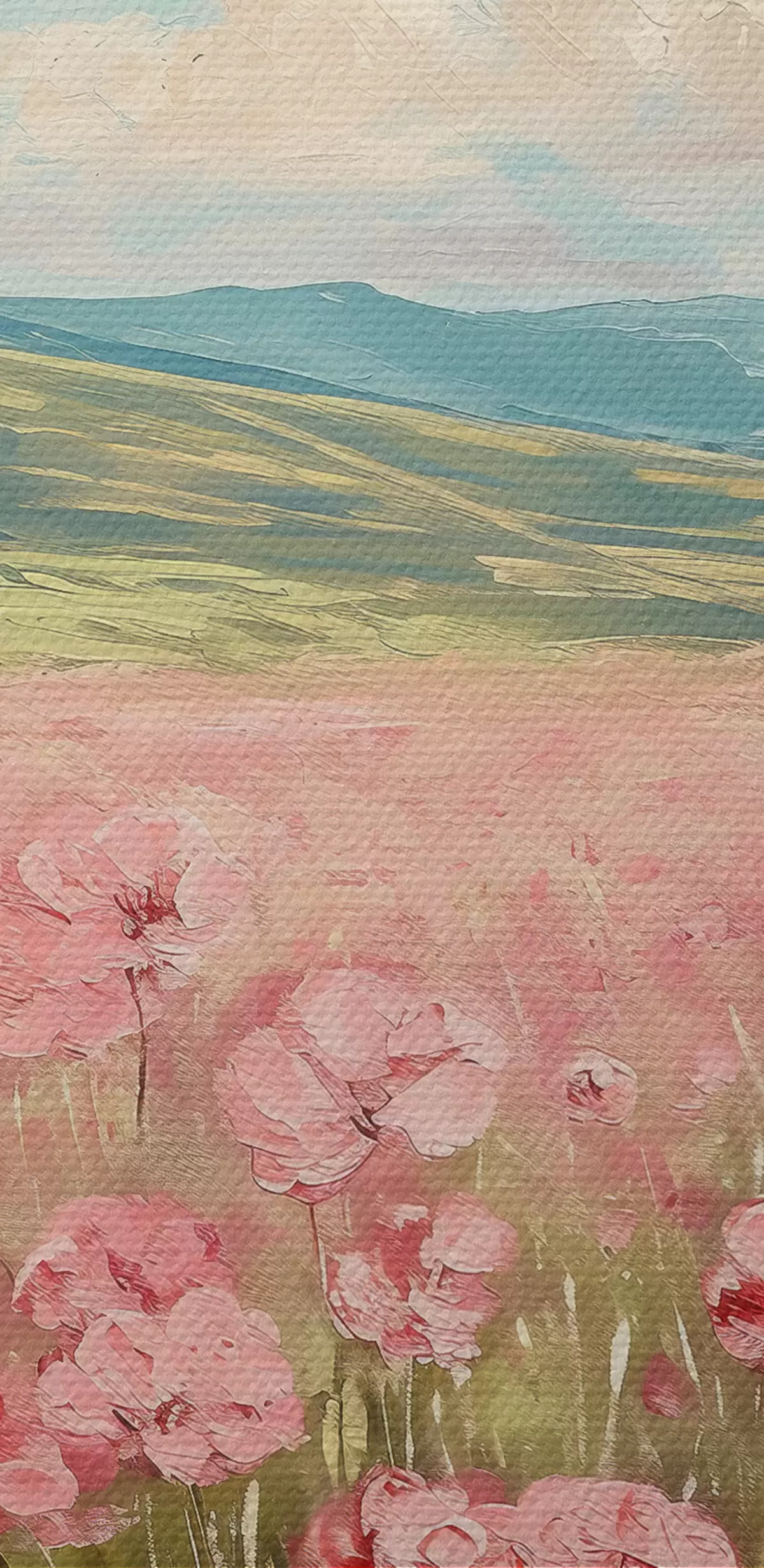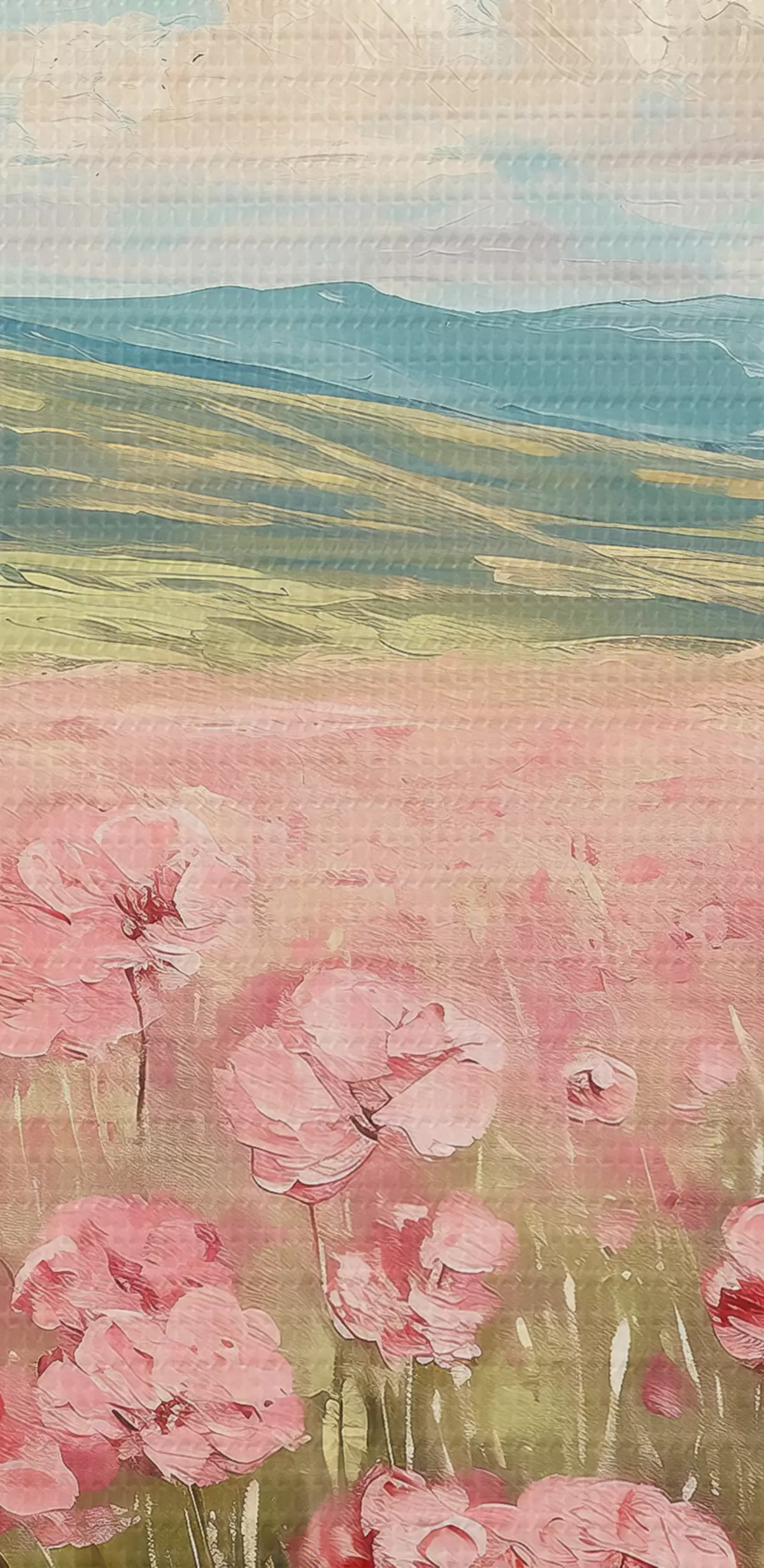 Wandbilder Wiese mit rosa Blumen, Berge, Naturlandschaft, blauer Himmel mit Wolken, Acryl Art. s40232
