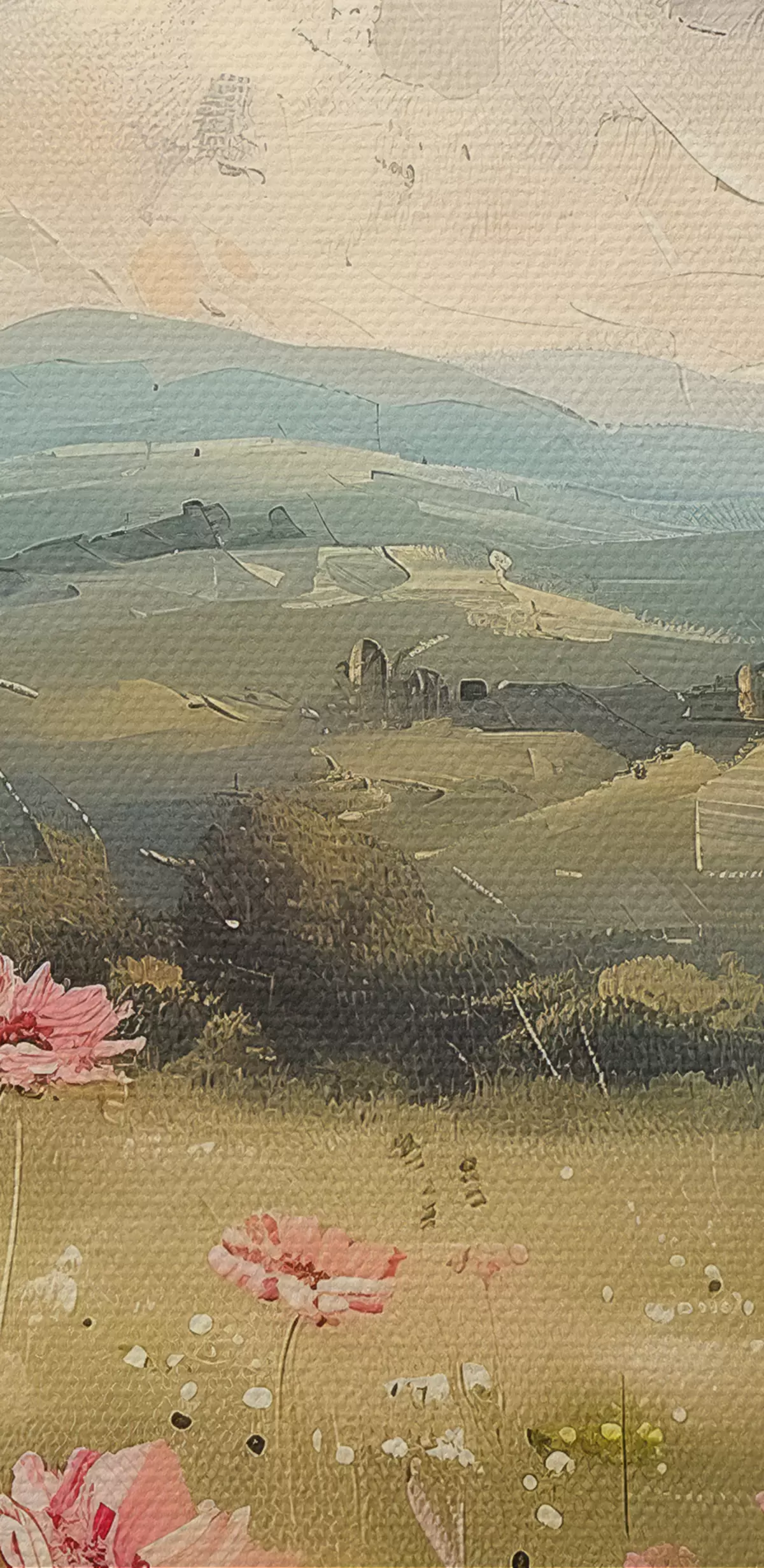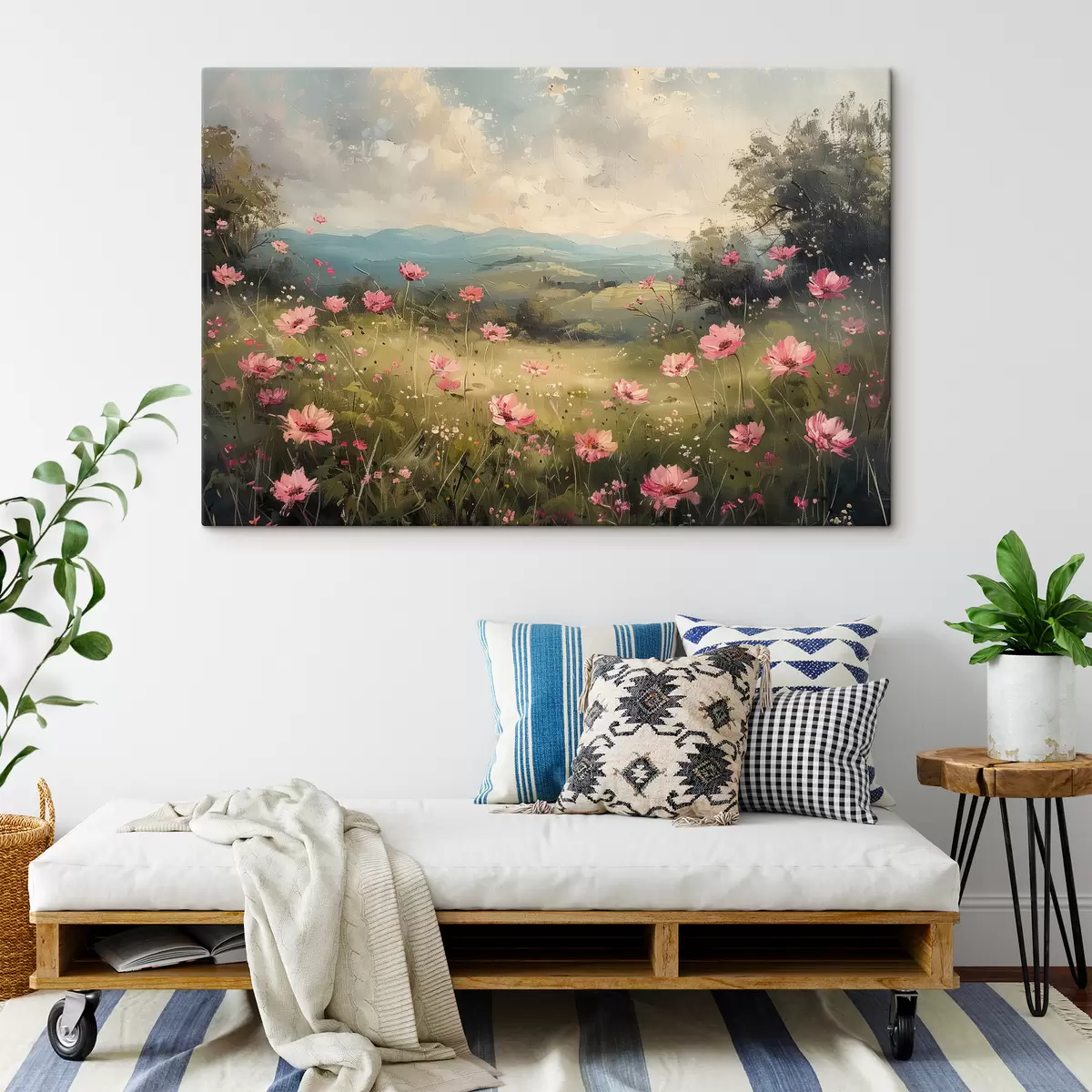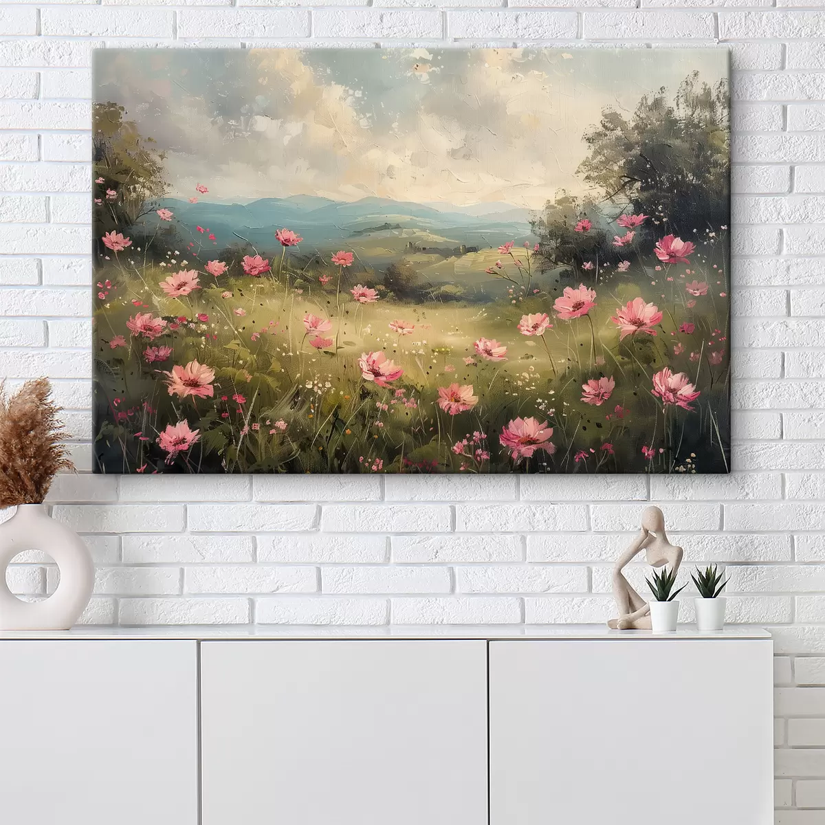 Wandbilder Wiese mit rosa Blumen, grünem Gras, Naturlandschaft, Himmel mit Wolken, Acrylzeichnung Art. s40234