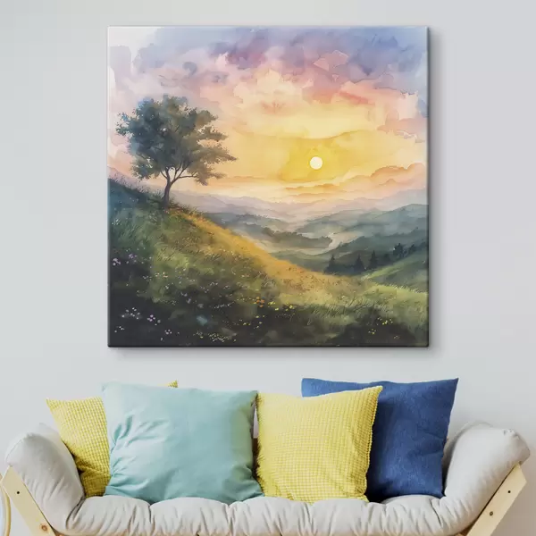 Wandbilder Wiese mit Hügeln und Baum, Blumen, Aquarell Art. s40303