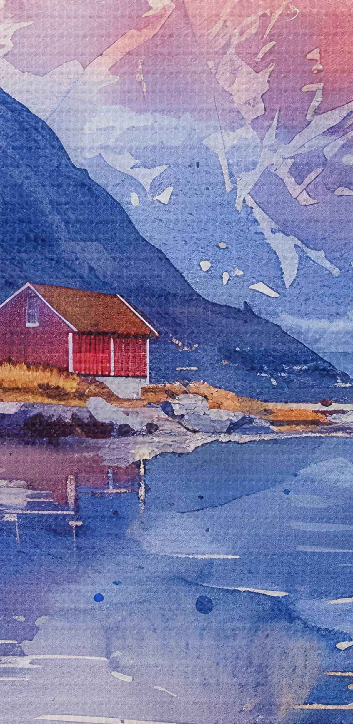 Wandbilder Norwegen Dorf, Sonnenuntergang Himmel, ruhigen Fluss, Berge, Aquarell Art. s40311