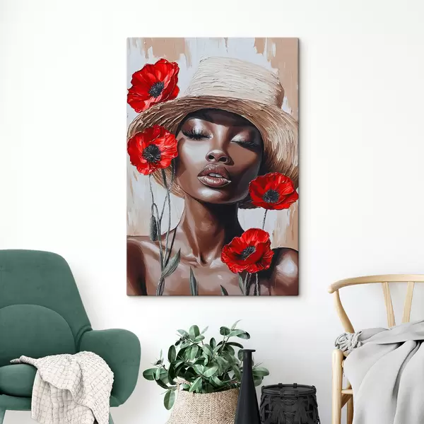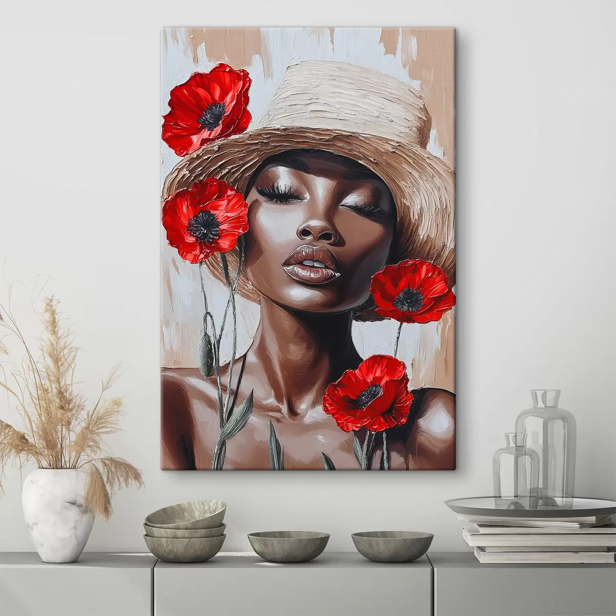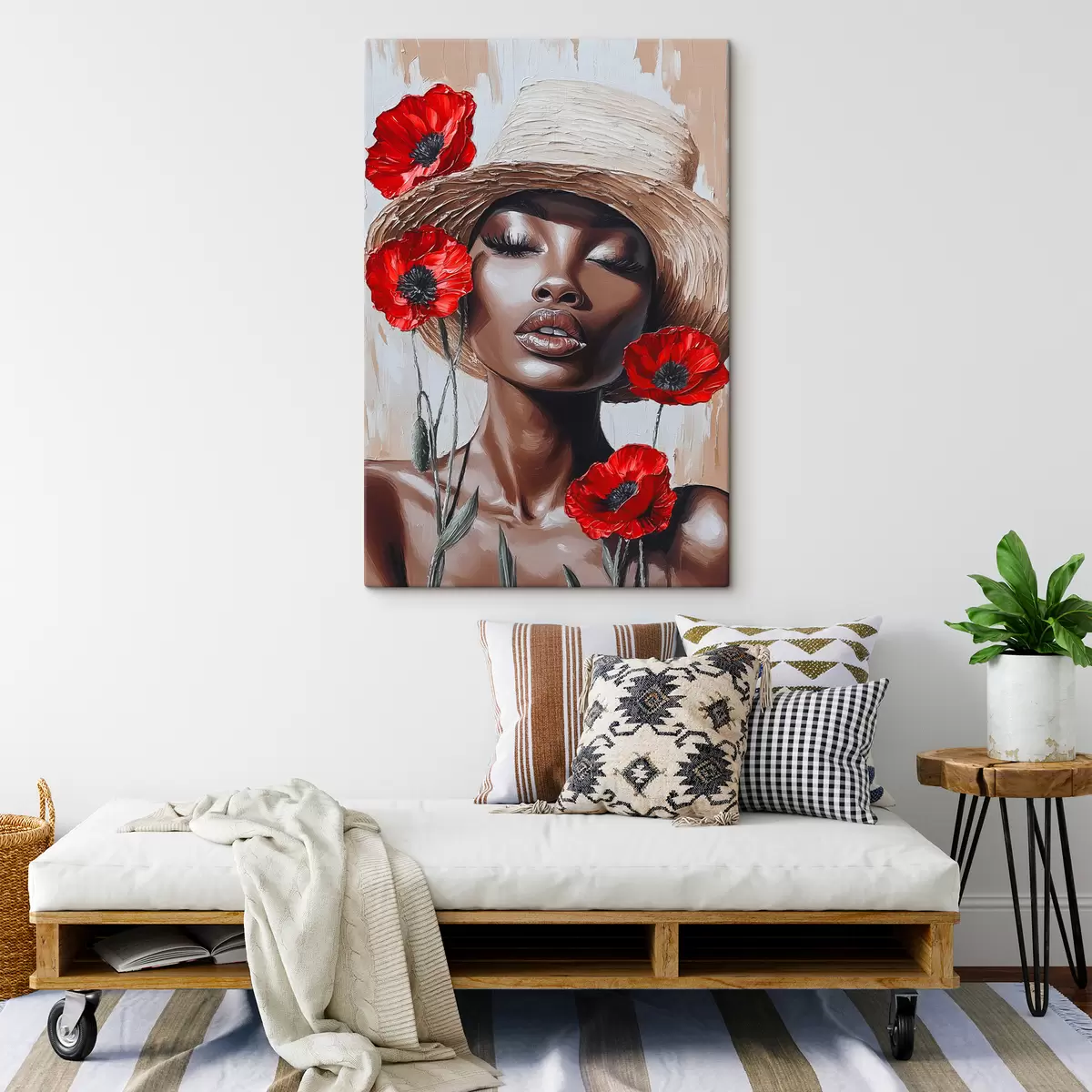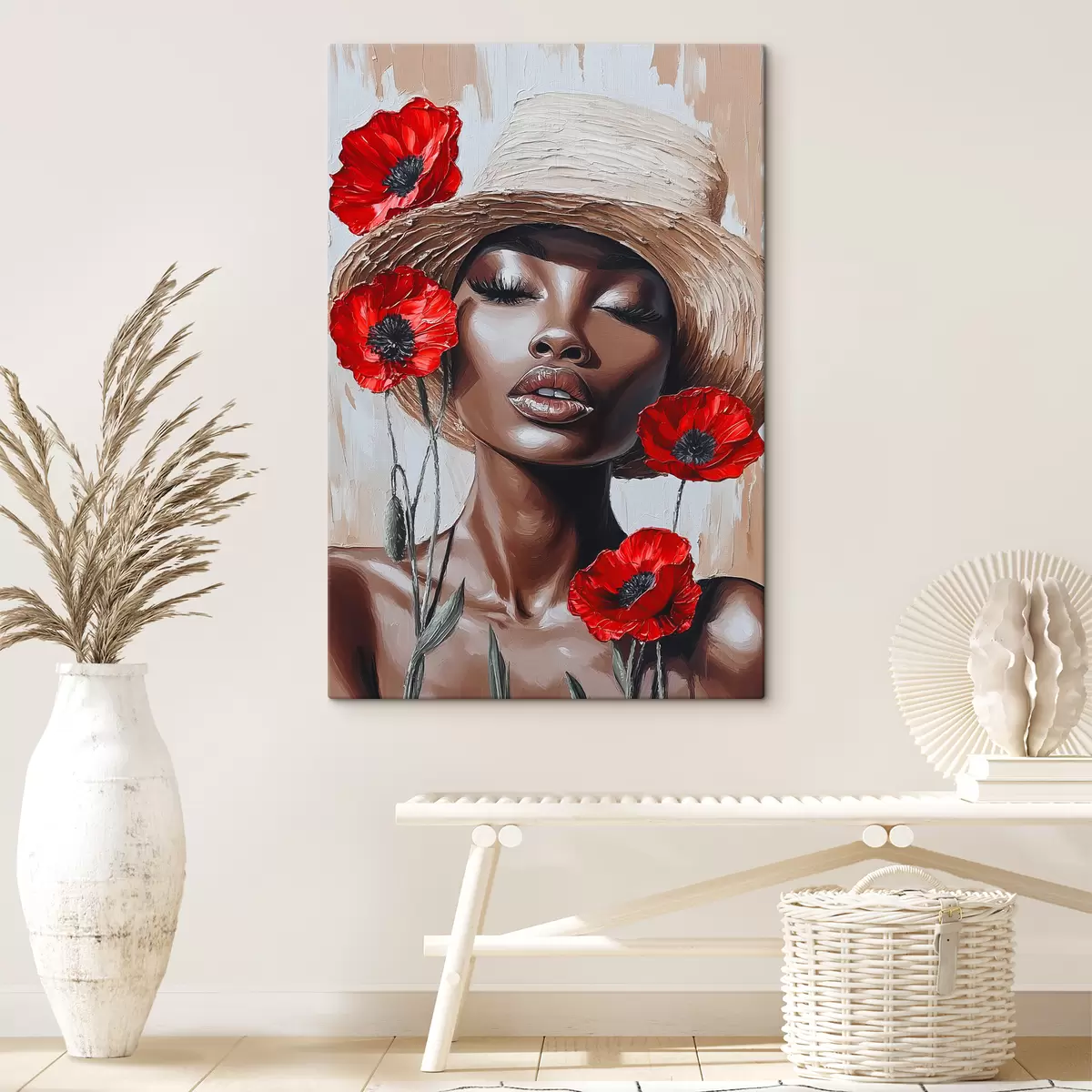Wandbilder Porträt einer Frau mit Hut und roten Mohnblumen s40350